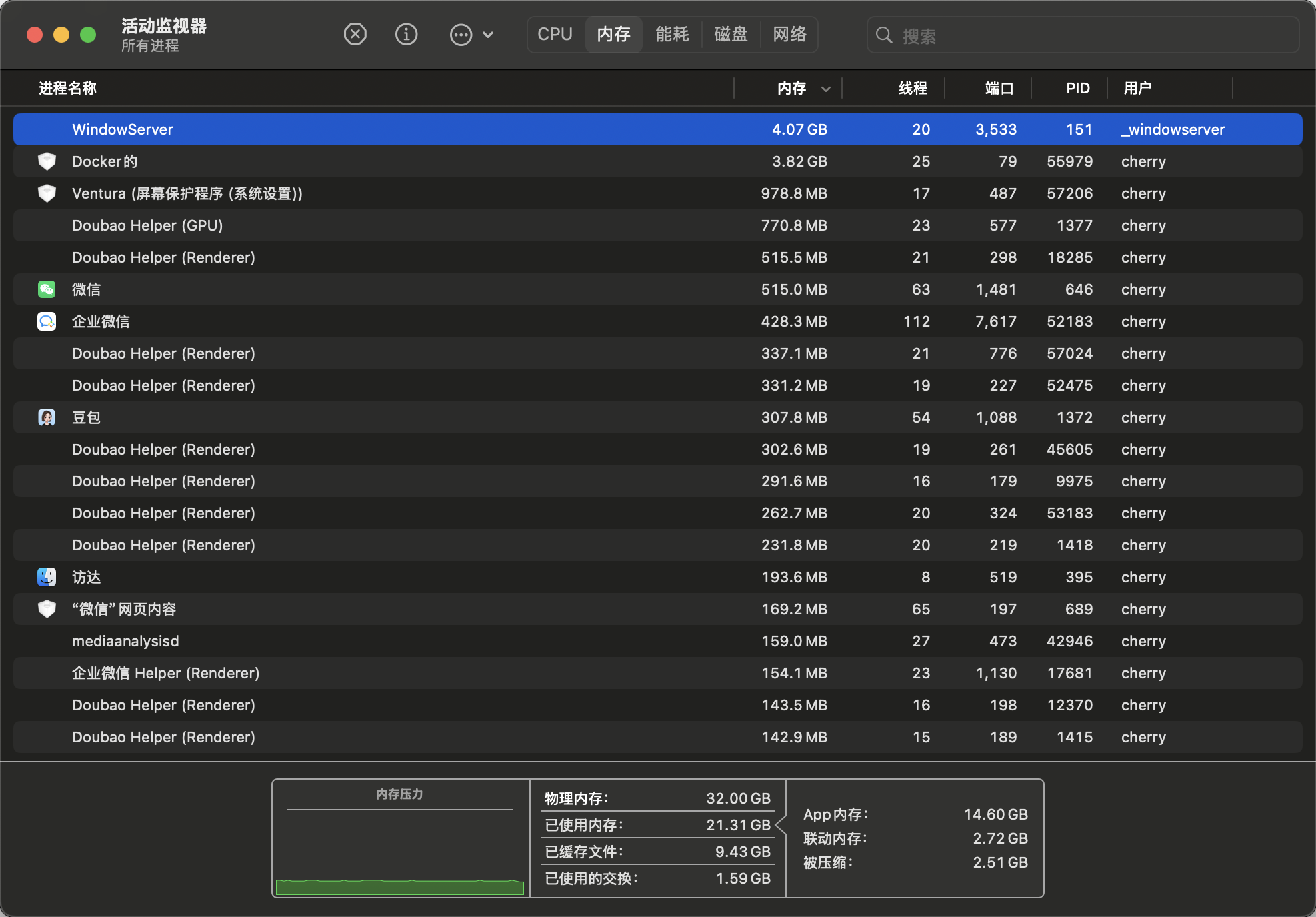 重启电脑后windowserver占用500mb左右,使用时间一周左右会到4,5g左右,之前有一次两周左右到10g