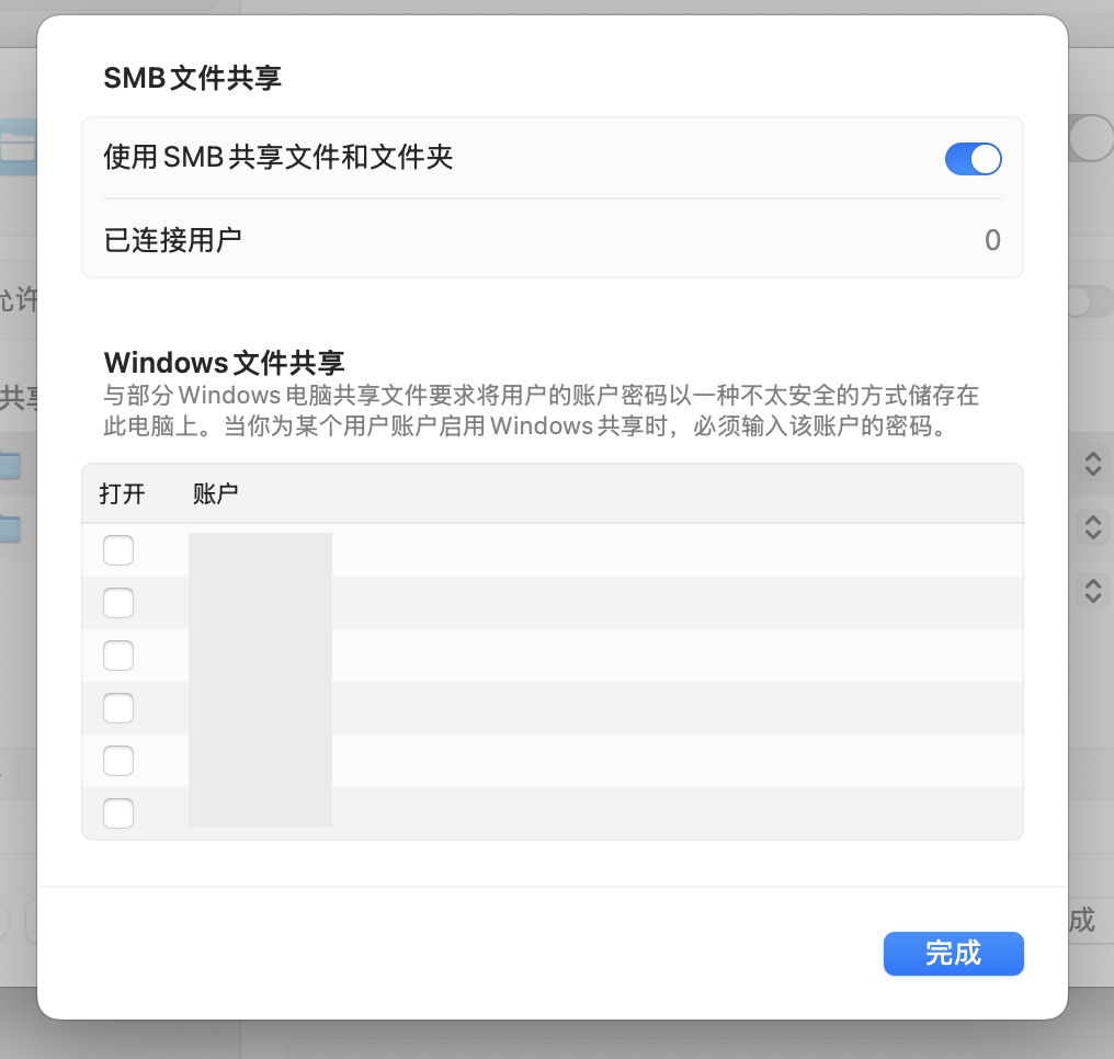 新 Mac 中,在文件共享-选项-SMB 文件共享 窗口中,会时不时的显示非常多的重复用户,很不正常。(如图)另外一张图是我旧电脑的 SMB 文件共享窗口,则正常显示了我启用的两个用户。