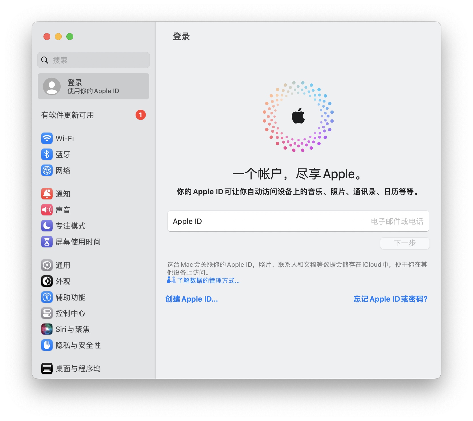 有一天突然自己退出来了。再往后尝试登录,在系统设置(如图所示)中输入Apple ID电子邮件地址和密码后,转圈转了一阵,又直接回到了图中的界面。多次尝试后仍无法登录。之前也联系过Apple支持(从操作来看主要是调整网络设置),也没有解决问题。