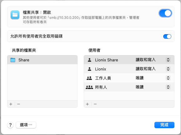 当我在共享设置中为Share文件夹选择“将权限应用到所有内含的项目”时,已在Share文件夹的权限会恢复正常,Lionix和Lionixs账户都能互相访问对方写入的文件。