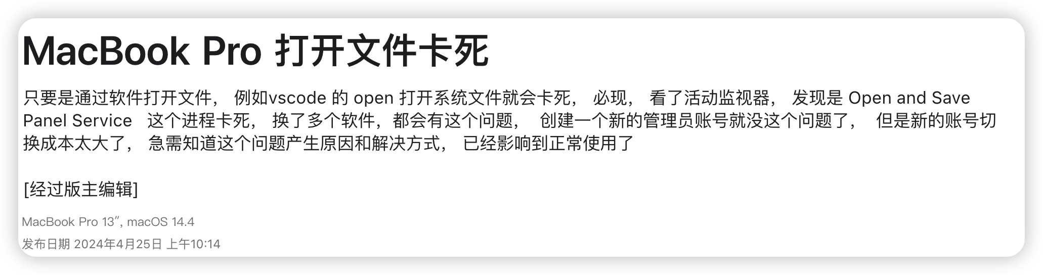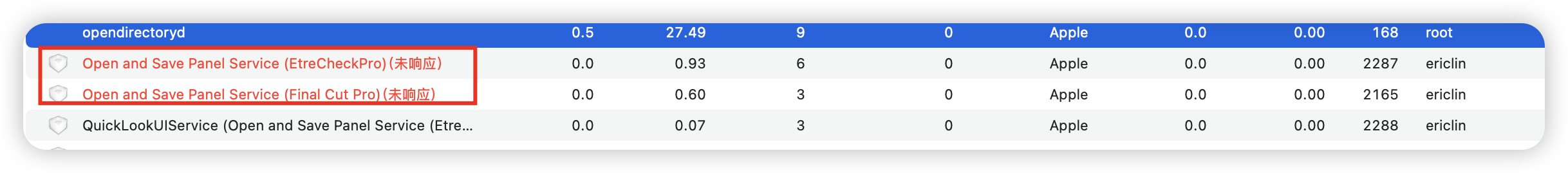 MacBook Air M2 版,一调用访达窗口就会open and save panel service未响应,无法正常完成读取和保存文件的操作