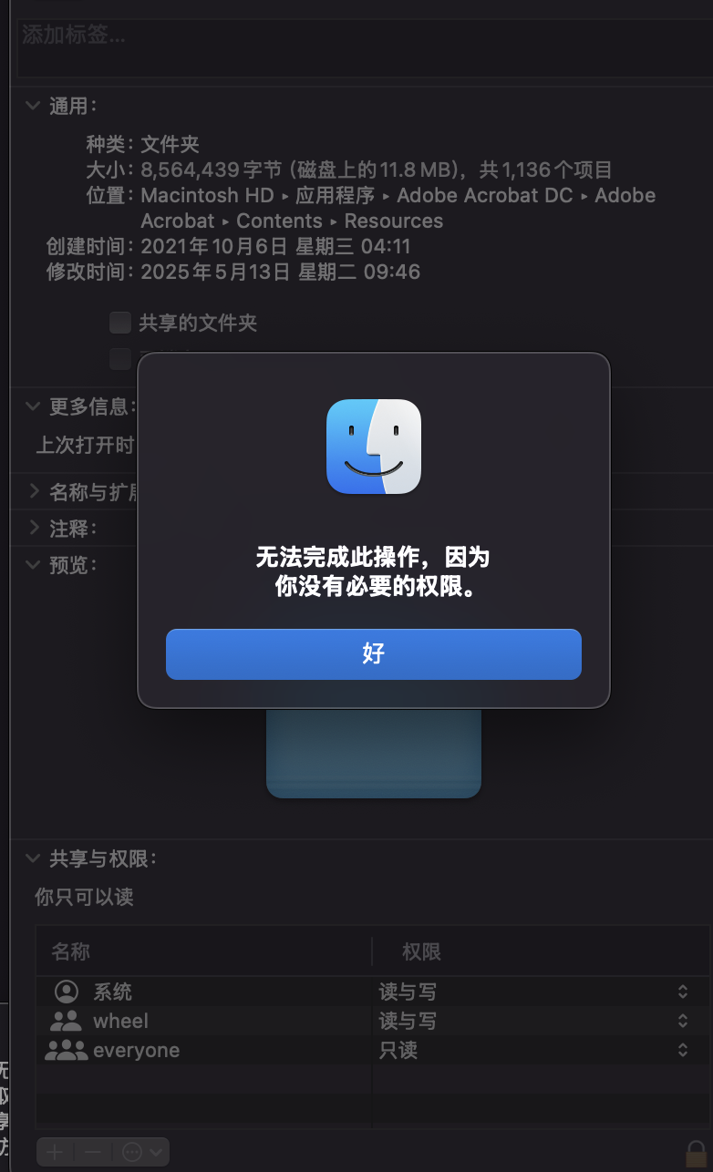 想要将1个文件,替换另一个文件,结果显示——“无法完成此操作,因为必须跳过某些项目。在每个项目下,选取“文件”>“显示简介”,确保取消选择“锁定”,然后检查“共享与权限”部分。在确定项目已解锁且未指定为“只读”或“无法访问”后,请重试。”