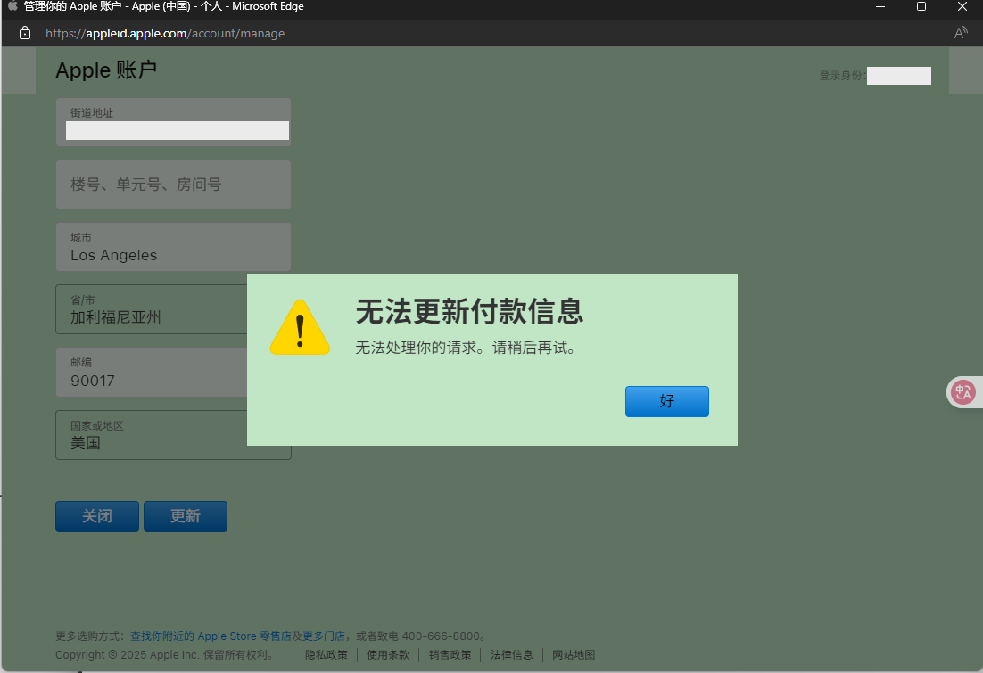 使用 window 系统通过浏览器在 https://account.apple.com/account 后台添加大陆支付失败