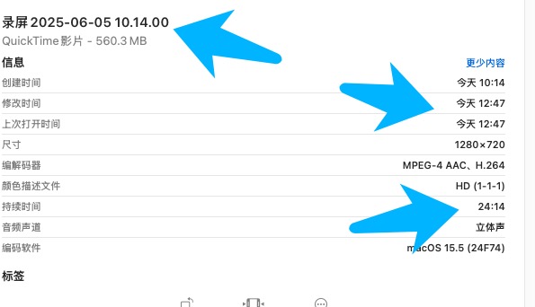 在macOS Sequoia 15.5 的Mac上录屏得到的文件明显短于录制时间