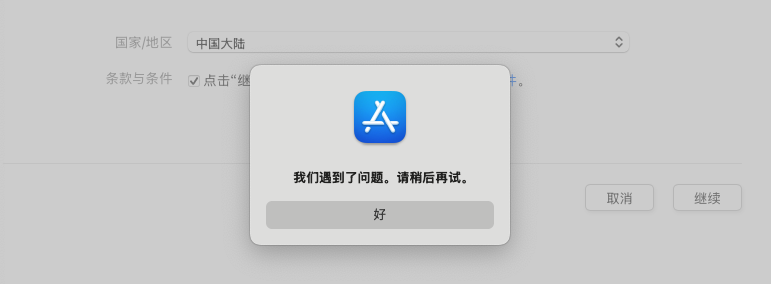 新创建的Apple账户在Mac上第一次登陆App Store时,一直提示“我们遇到了问题,请稍后再试。”