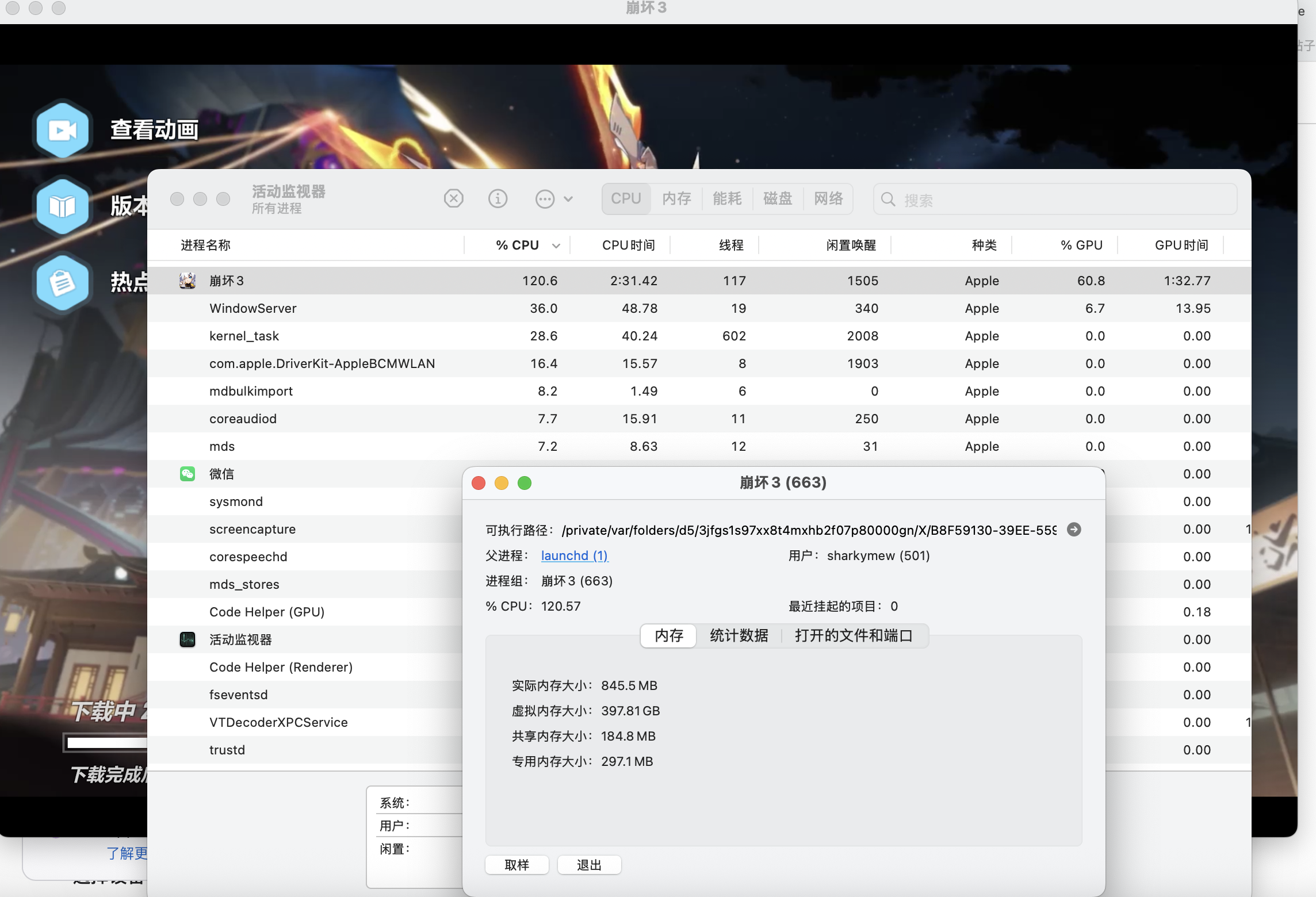 Mac 运行《崩坏 3》时触发内核错误崩溃,且在活动监视器中跳转进程文件路径时崩溃,可按以下步骤排查解决:
