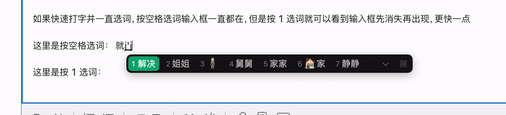 如果快速打字并一直选词,按空格选词输入框一直都在,但是按 1 选词就可以看到输入框先消失再出现,更快一点