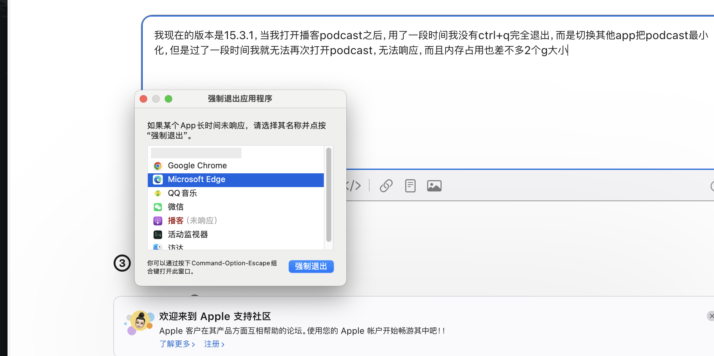 我现在的版本是15.3.1,当我打开播客podcast之后,用了一段时间我没有ctrl+q完全退出,而是切换其他app把podcast最小化,但是过了一段时间我就无法再次打开podcast,无法响应,而且内存占用也差不多2个g大小