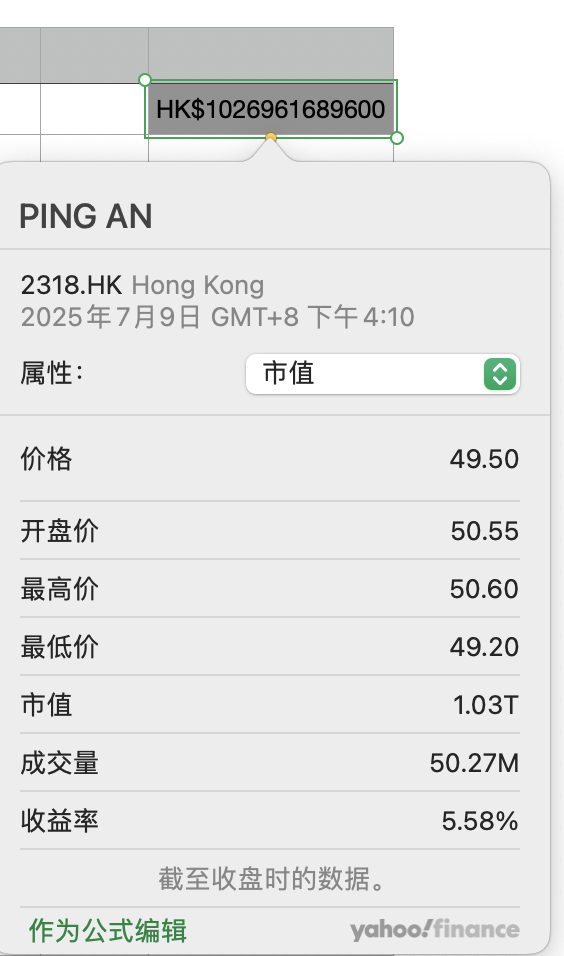 numbers插入股票代码时,中国平安(2318.HK)市值股价显示错误