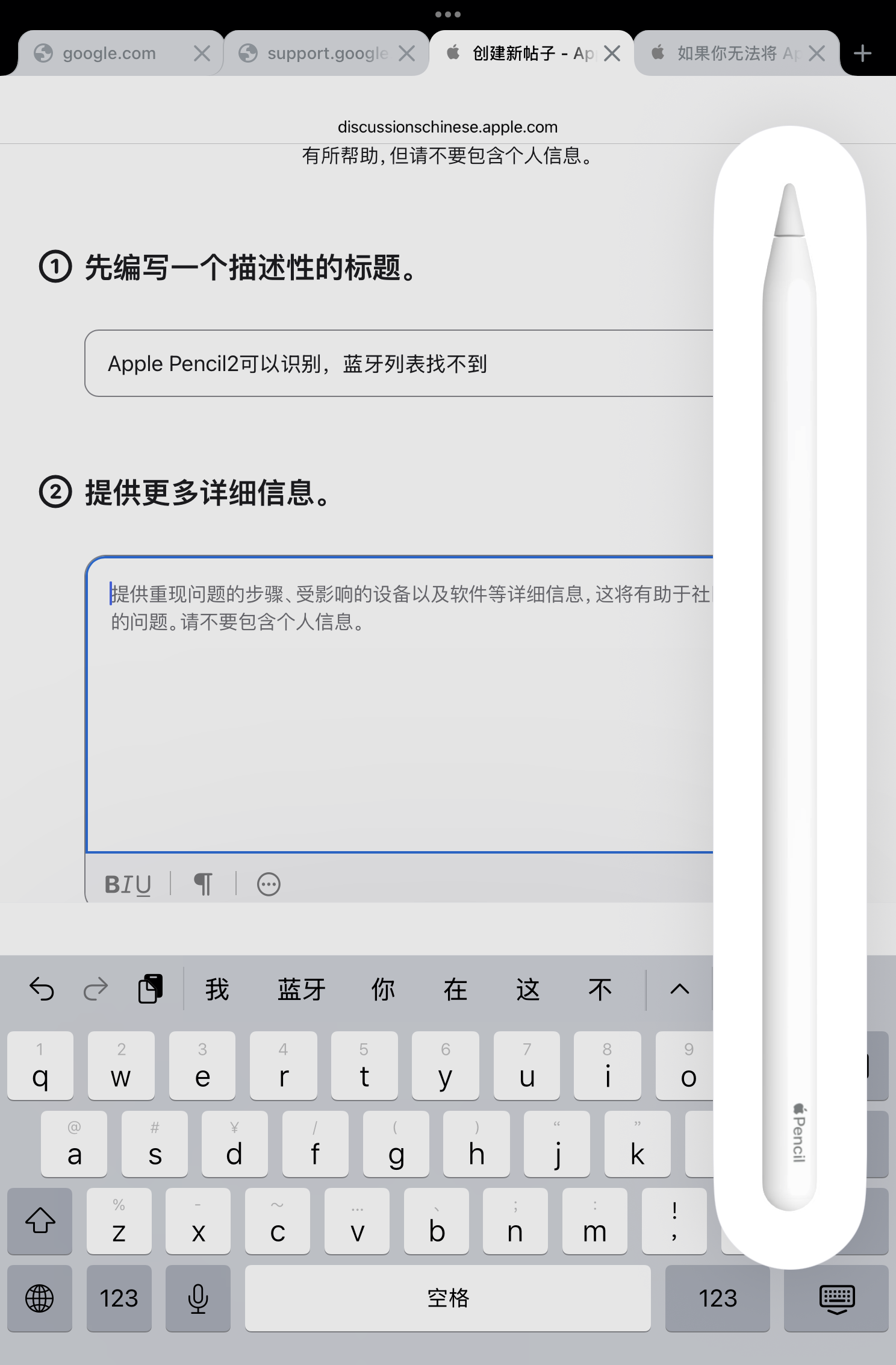 所有官方和非官方的教程我都试过了,现在唯一的问题是蓝牙列表里没有Apple Pencil 2,导致无法连接。