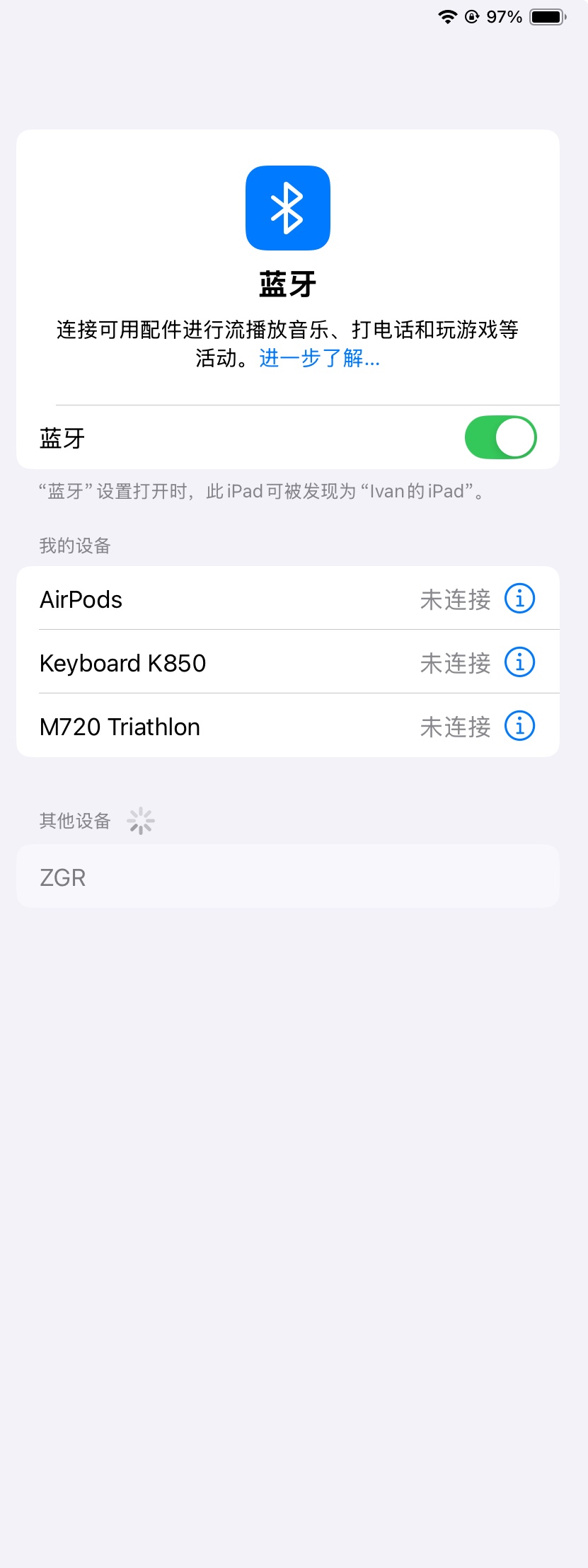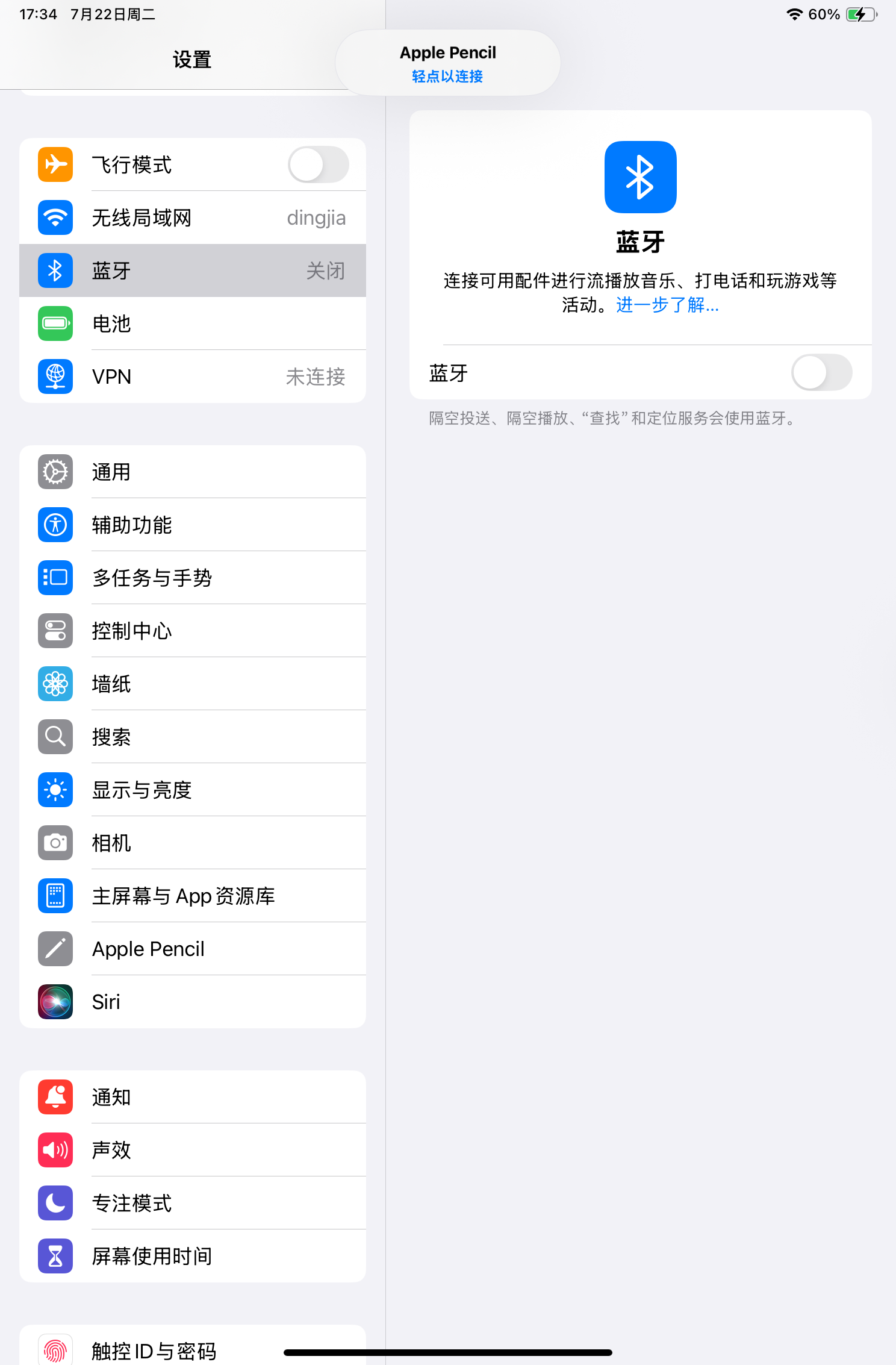 另外,蓝牙关闭状态将Apple Pencil 2 磁吸到iPad上,如图,点击连接进入蓝牙列表,无设备显示……