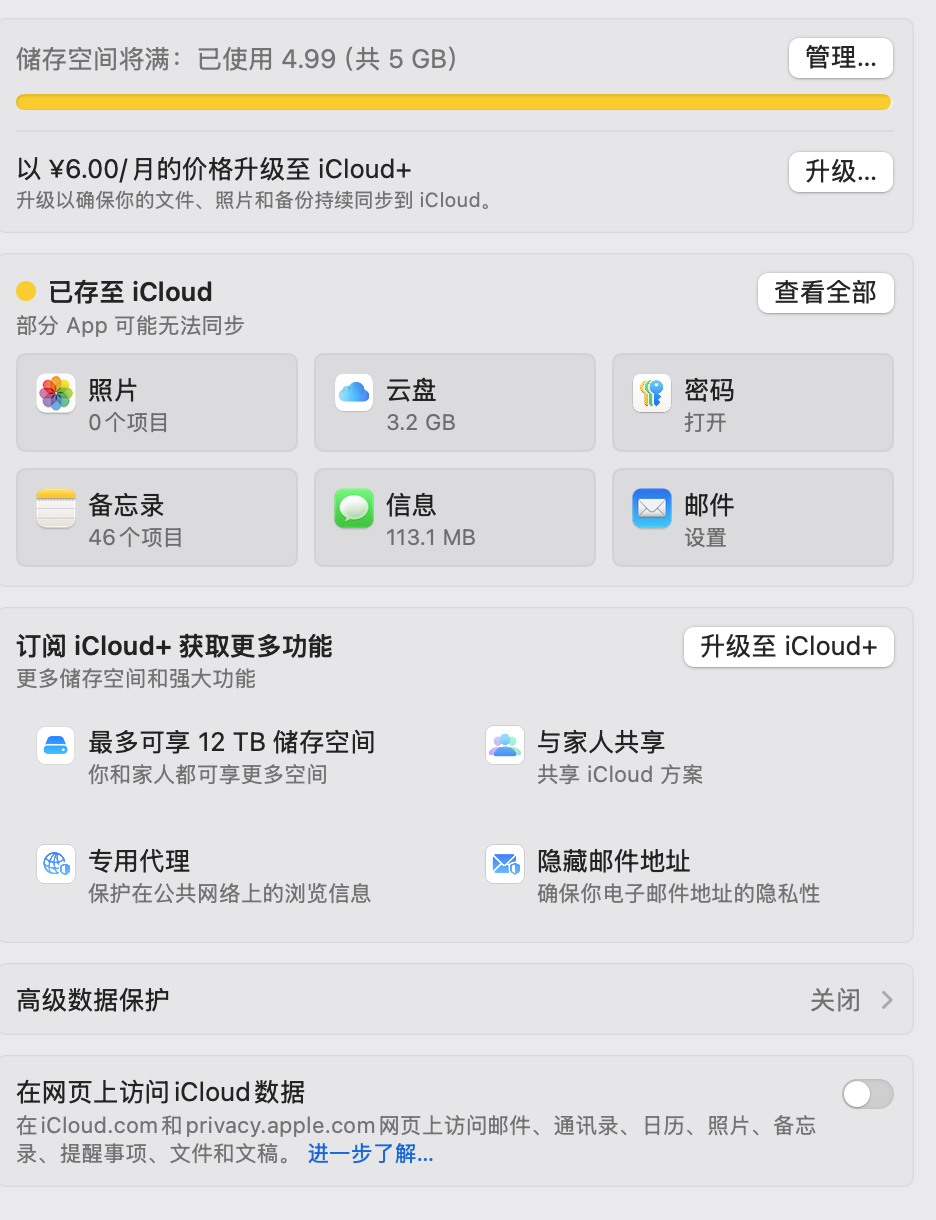 稍早前想看一下电脑储存空间,随后点了一下icould优化,然后我的桌面文件和文稿开始被icloud备份,所有文件都在有云图标