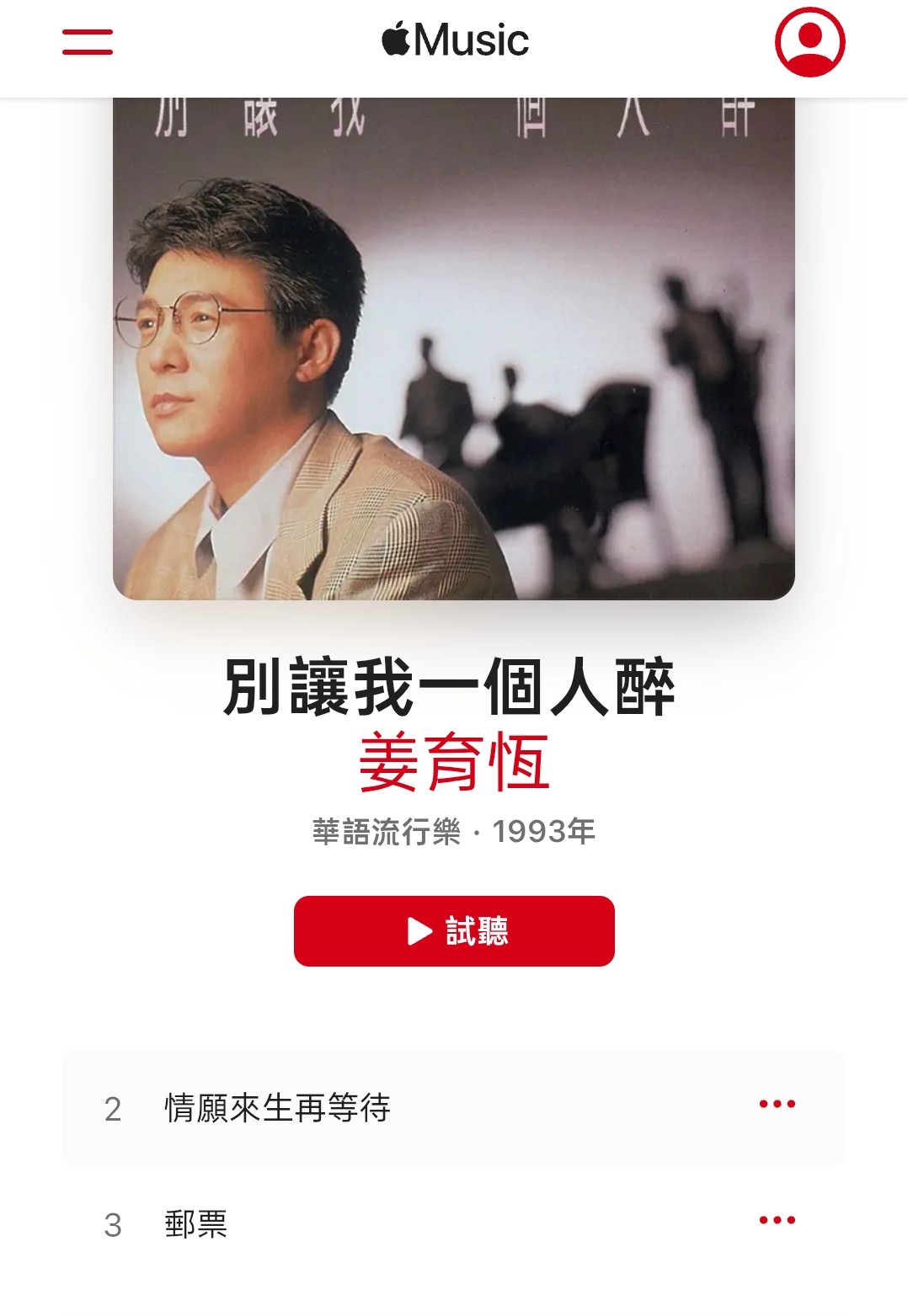 Apple Music 上姜育恒的专辑《别让我一个人醉》已经持续半年仅剩两首歌了