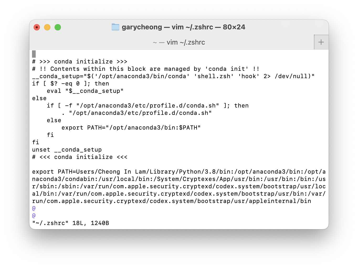 /Users/garycheong/.zshrc:export:17: not valid in this context: Lam/Library/Python/3.8/bin:/opt/anaconda3/bin:/opt/anaconda3/condabin:/usr/local/bin:/System/Cryptexes/App/usr/bin:/usr/bin:/bin:/usr/sbin:/sbin:/var/run/com.apple.security.cryptexd/codex.system/bootstrap/usr/local/bin:/var/run/com.apple.security.cryptexd/codex.system/bootstrap/usr/bin:/var/run/com.apple.security.cryptexd/codex.system/bootstrap/usr/appleinternal/bin這段文字的狀態,並且能讓正常的指令生效。