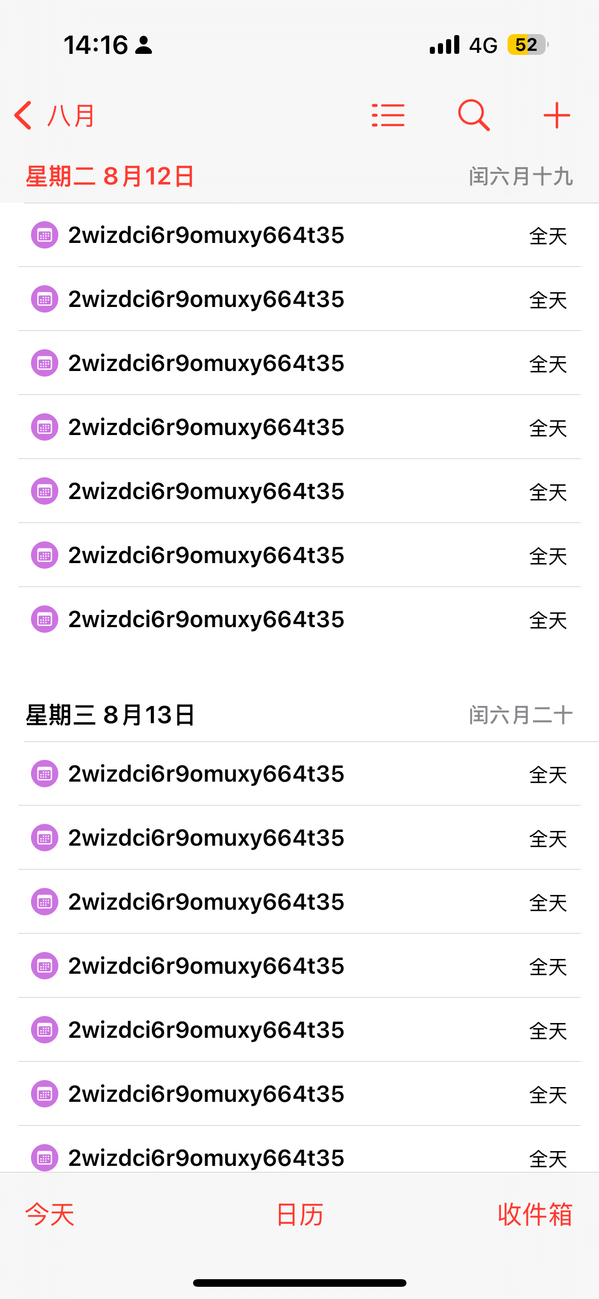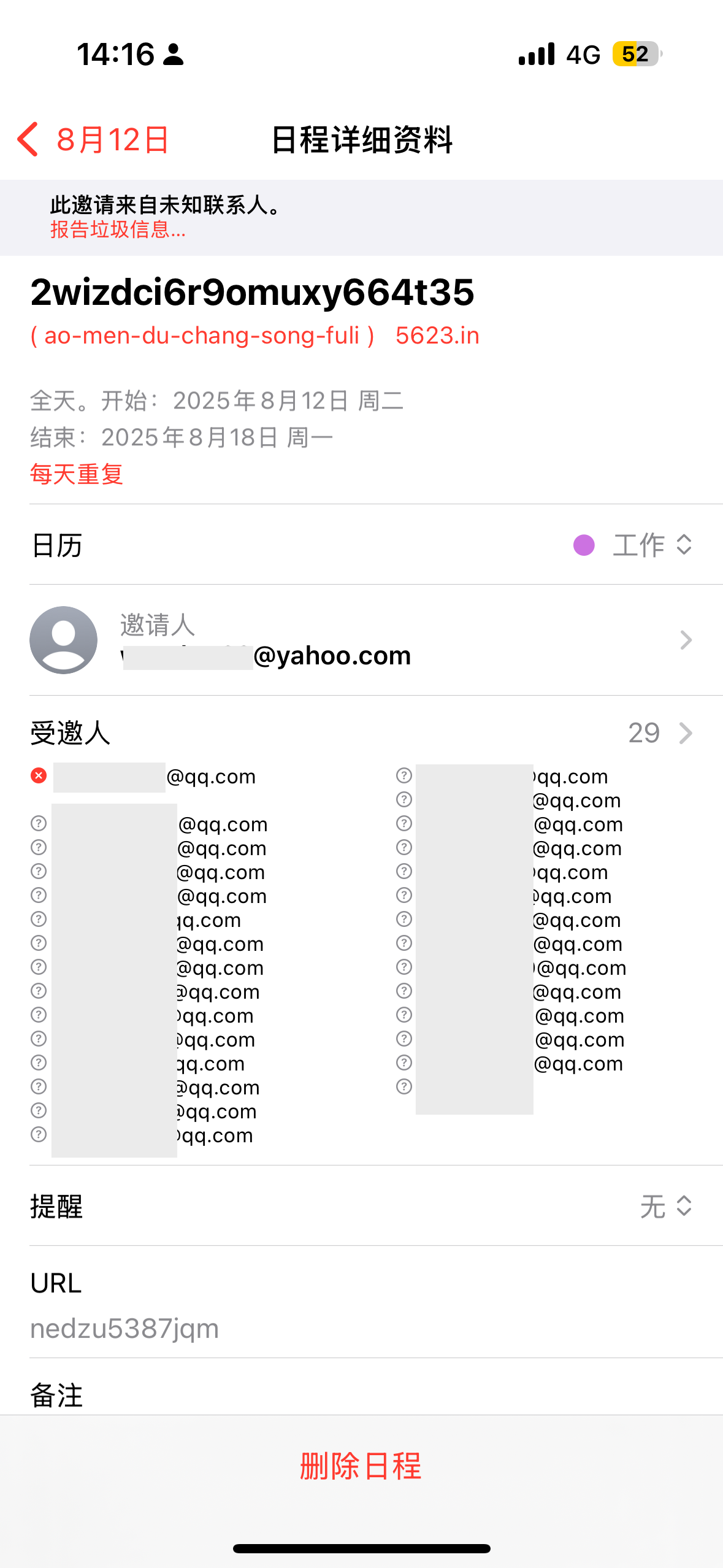 如题、今天打开日历想设置提醒,但是没想到打开就是如下图所示的不明意义的邀请信息全部是相同标题,而且每天的日程都有,从月历开始向下滑动到2100年都还有,请问我该怎么移除这些东西?每次往下滑动月历都卡