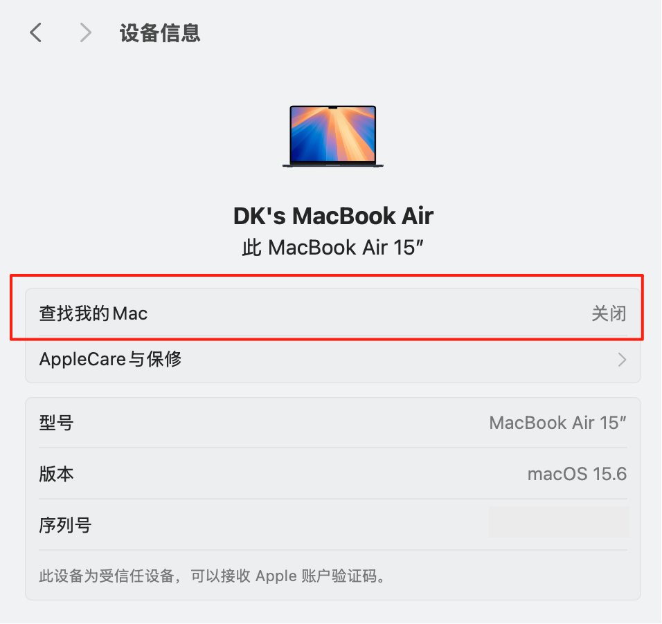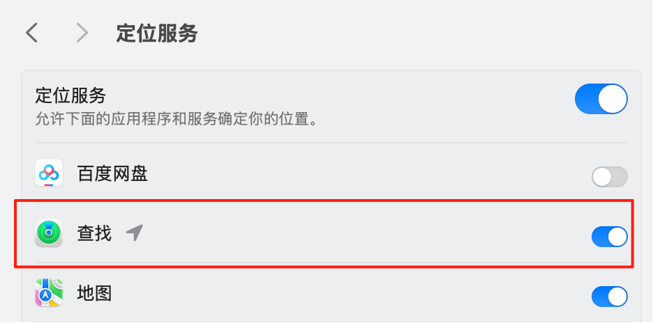 在查找中找不到本机,且设备信息里显示“定位”关闭状态。