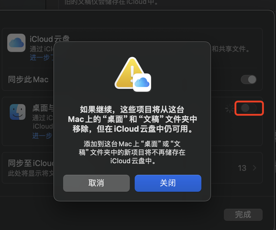 在 Mac 上误操做 iCloud 同步,关闭时提醒会删除本地文件,目前桌面无文件