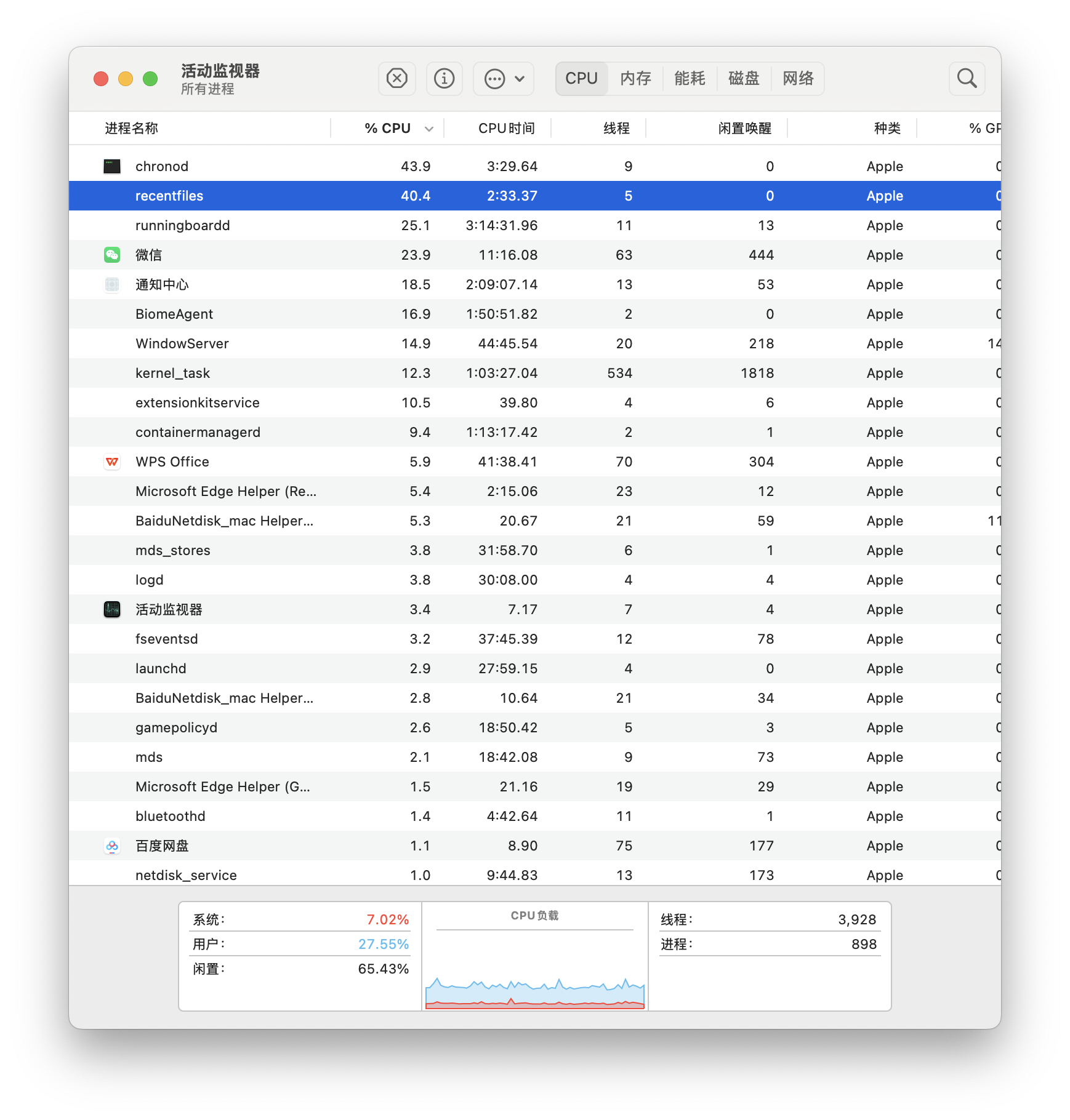 recentfiles进程是什么?占用大量CPU,Mac 刚开机CPU温度都有90°