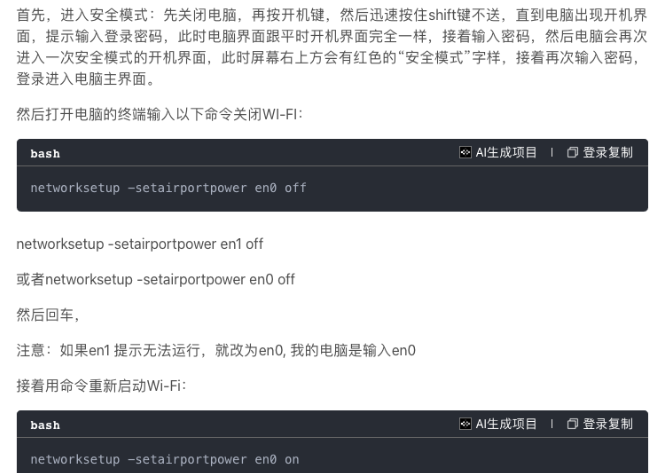 安全模式下通过终端指令重启。操作过后显示是You cannot set Wi-Fi power because all AirPort network services are disabled