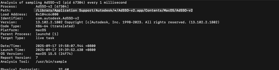 对进程取样后发现,进程位于: /Library/Application Support/Autodesk/*/AdSSO-v2.app/Contents/MacOS/AdSSO-v2