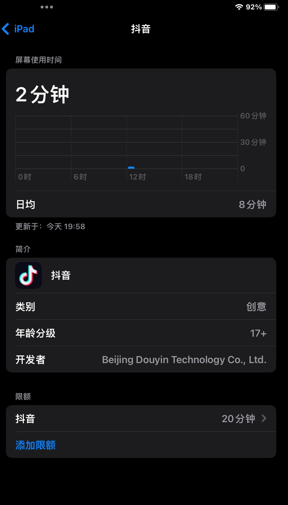 原标题:我给我的抖音限额20分钟,没开设备共享,今天刷了两分钟后,自动限额了,没到时间