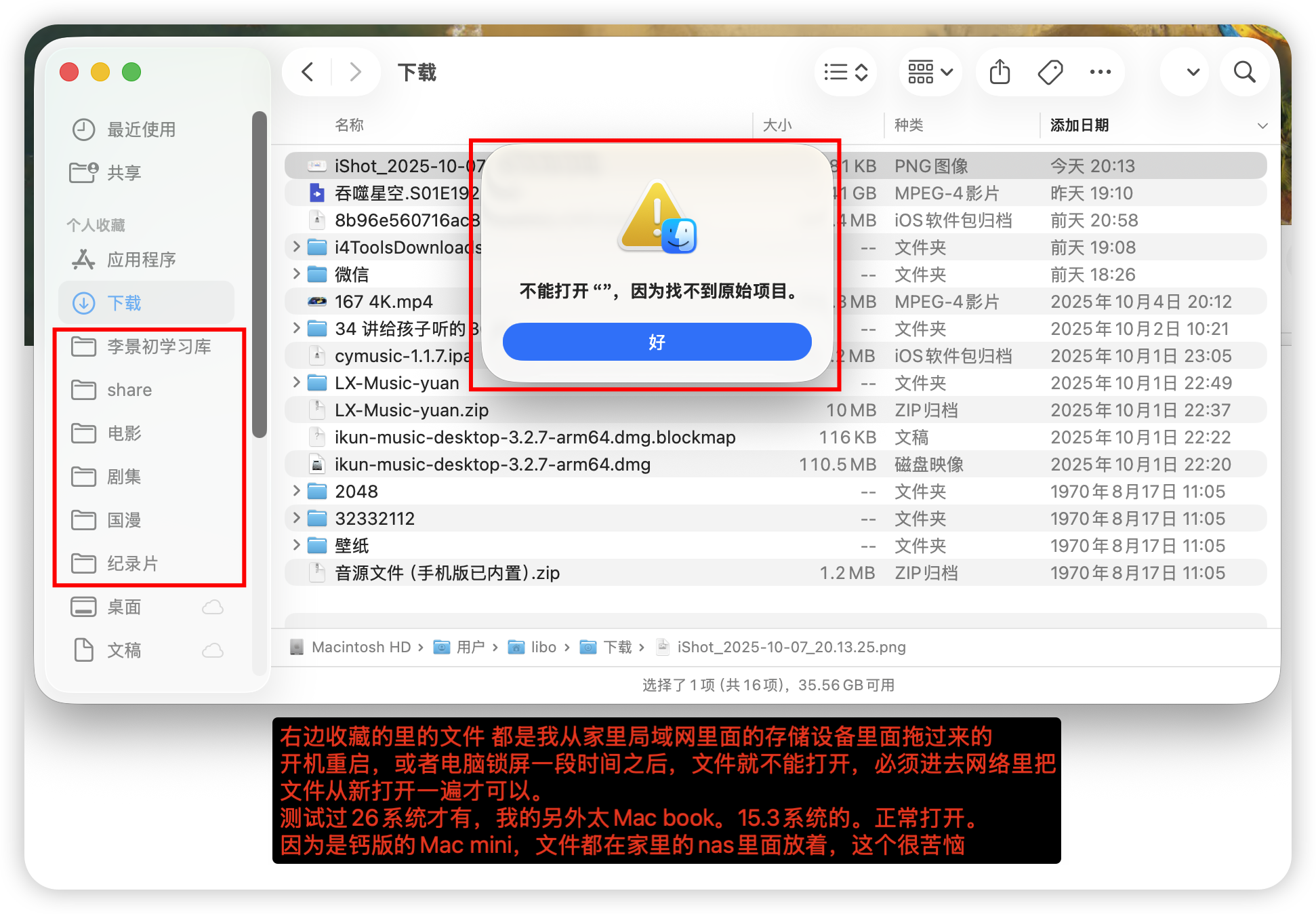 macOS26 访达-网络NAS添加到个人收藏的文件无法打开