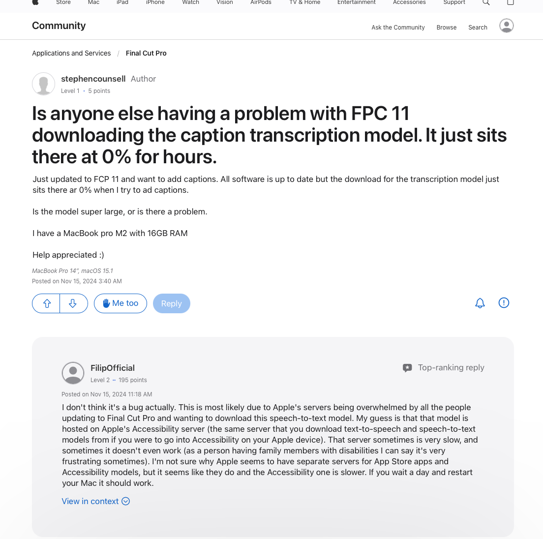[标题经过版主编辑] 原标题: Final Cut Pro首次使用转写为字幕功能时无法下载转写模型