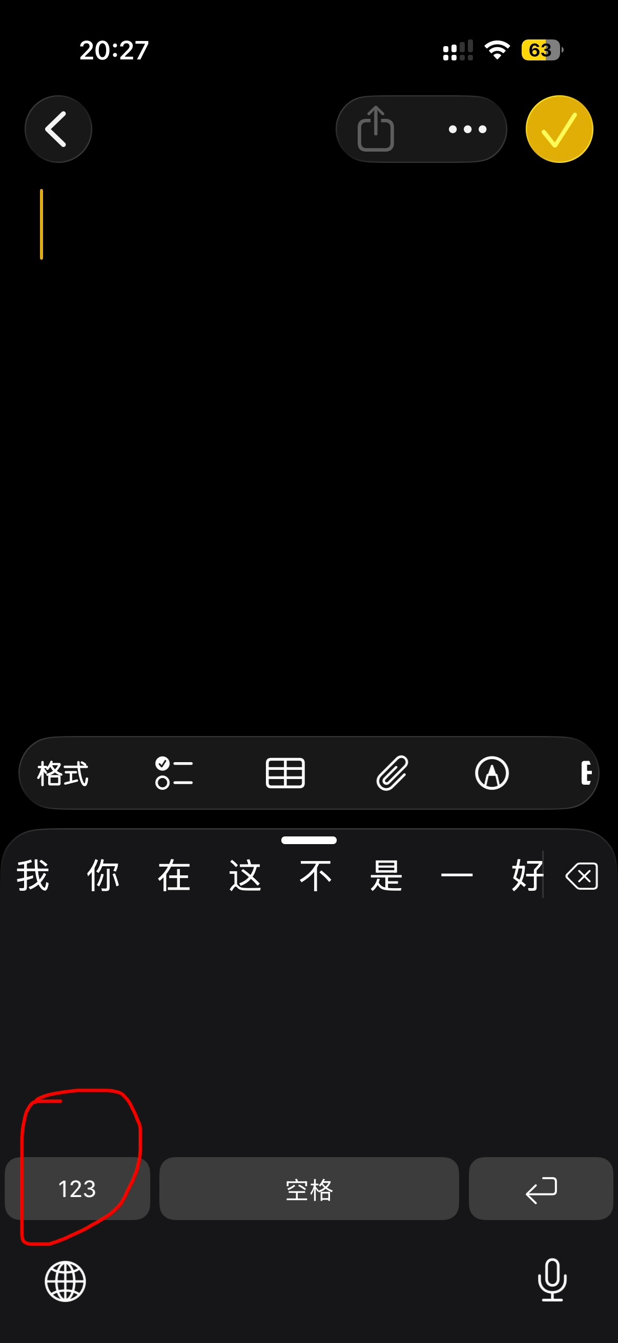 苹果17,比如在备忘录中,中文手写输入下,按左下角的"123"键,无法转入数字键盘,这个功能在我的老机子上是正常的