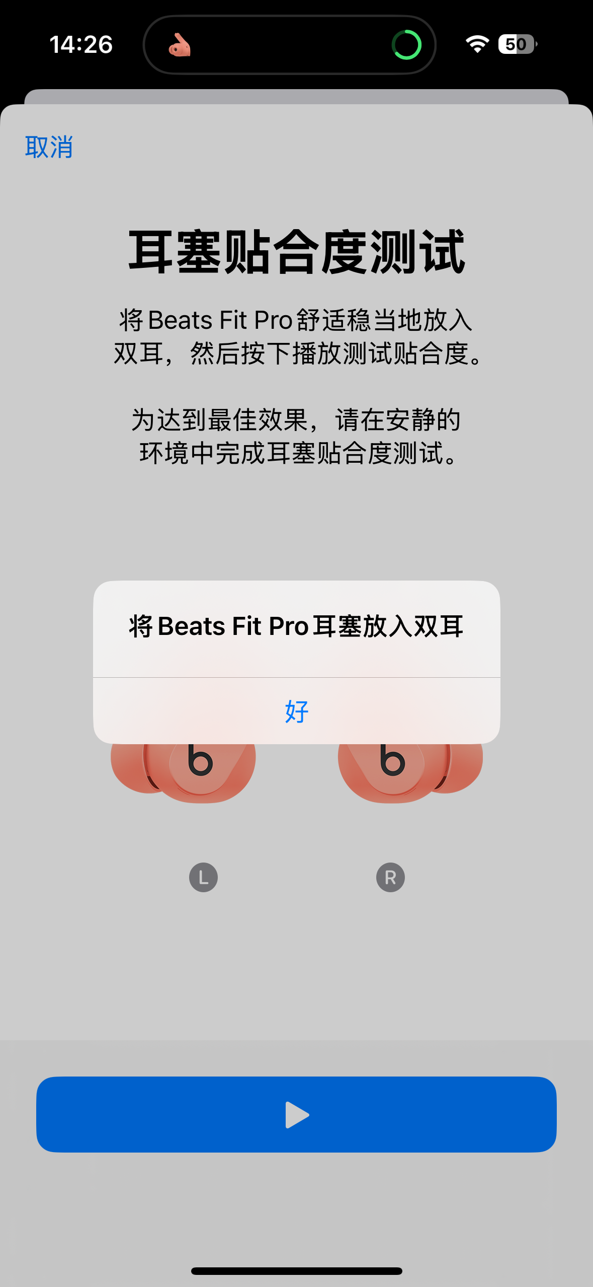 新耳机,配对后进行耳塞贴合度测试,这一步点击“好”后仍然弹窗“请放入双耳”