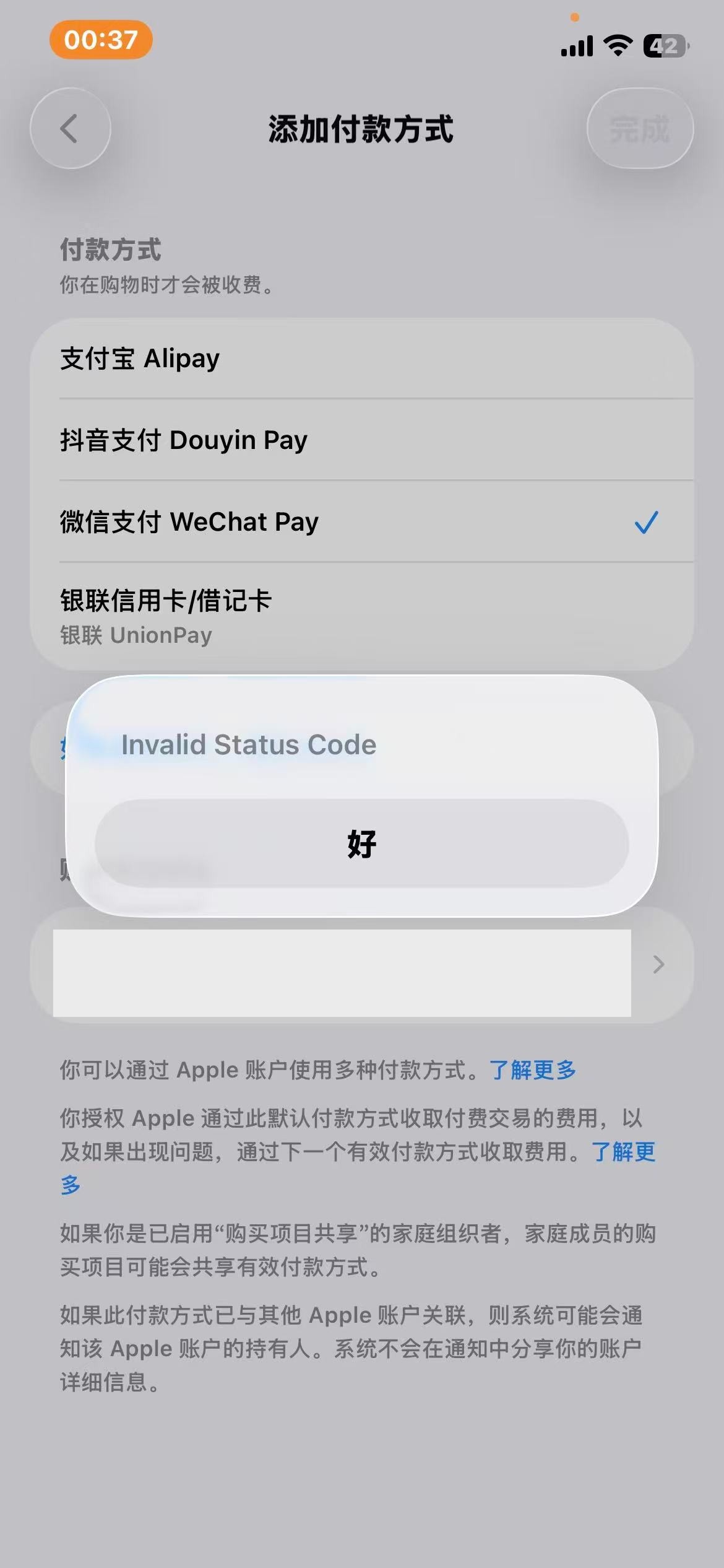 我的付款信息一直绑定的是支付宝,但是我常用微信比较多,支付宝经常没钱,但是我续的还有icloud服务,所以到续费日期他会让我更新付款信息,因为我支付宝没钱,我之前都会选择把支付宝转点钱,之后更新付款信息,但是在今天我打算续费软件vip的时候,发现一直支付失败,我就想着更新付款信息,但是今天点更新付款信息之后,他给我弹出来了一个“invalid status code”的弹窗,之后他就更新不了付款信息情况如下,求解决