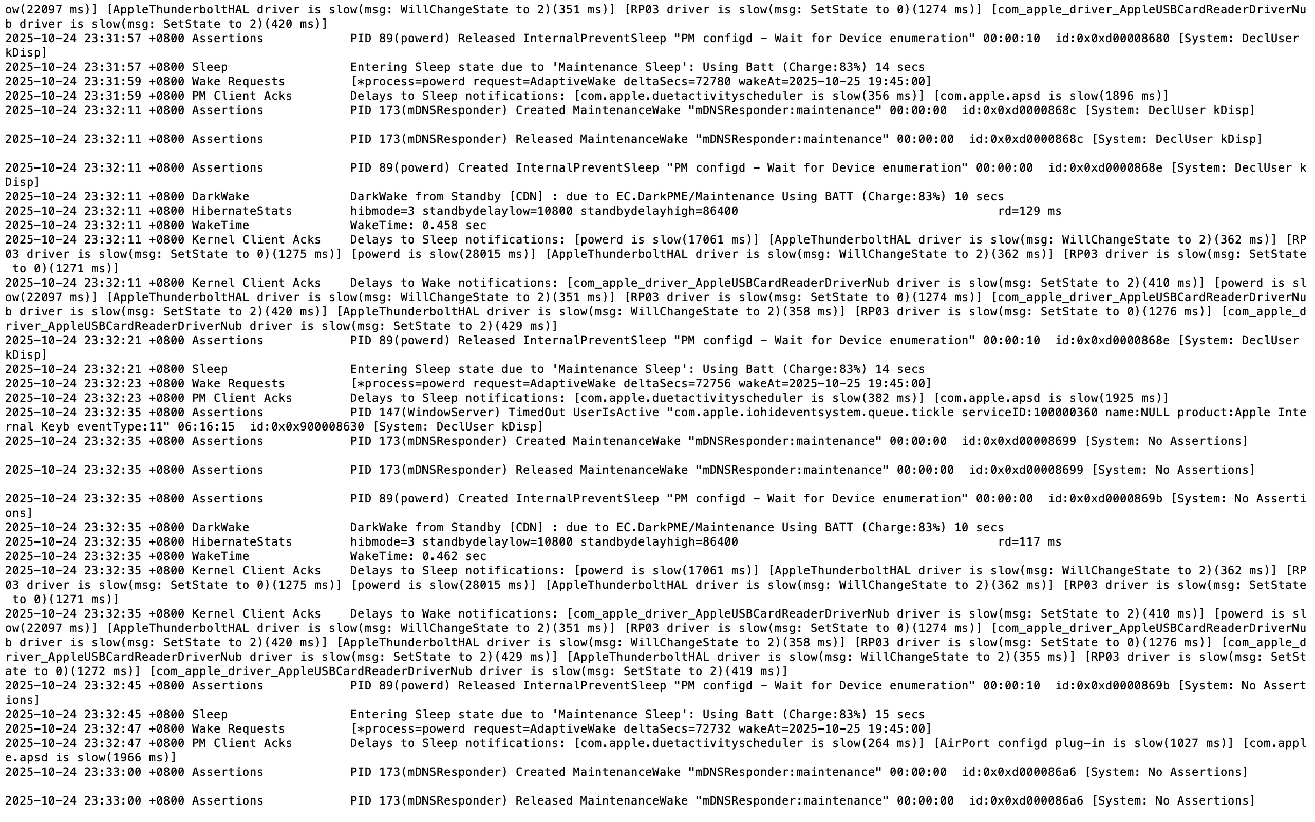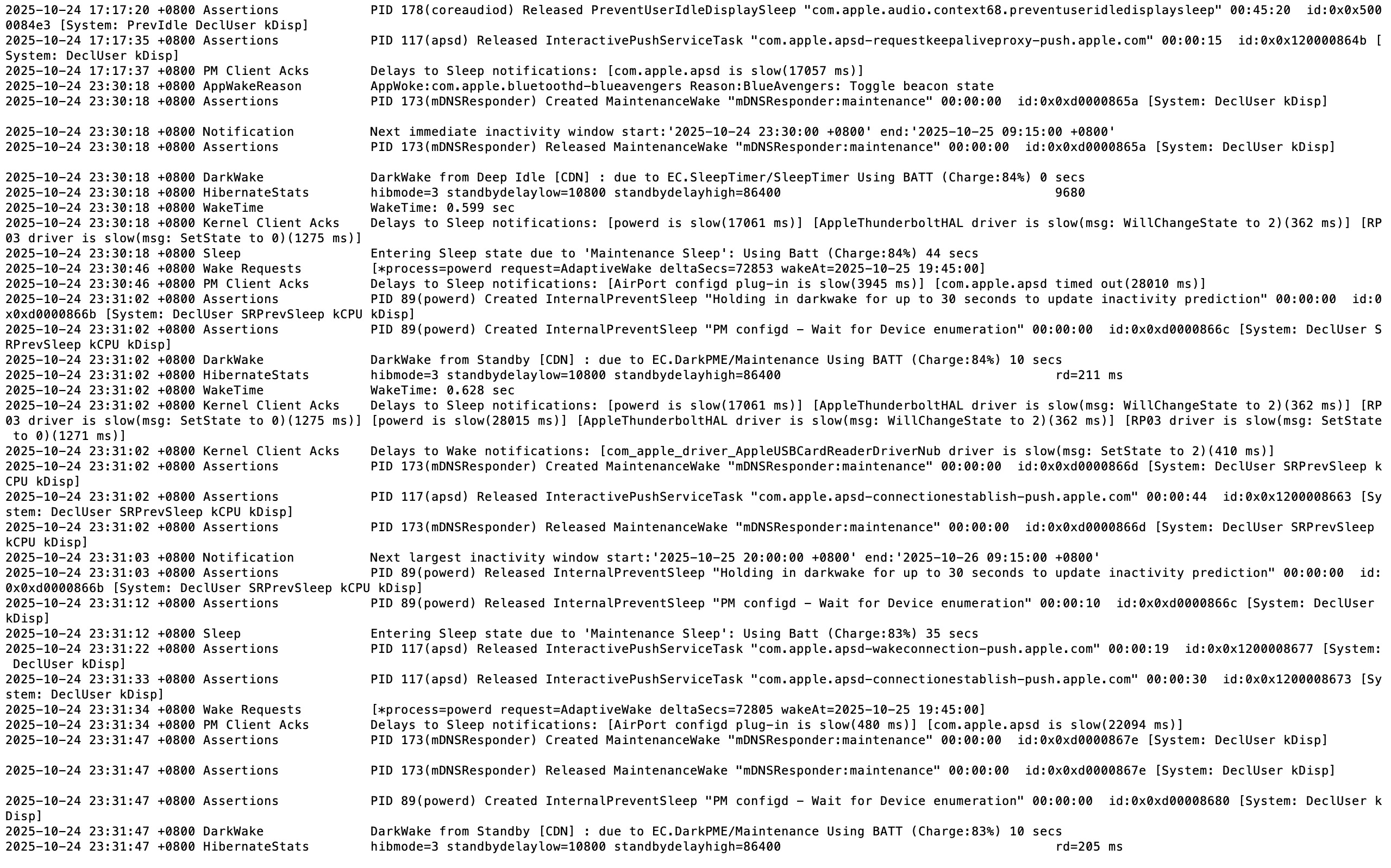 mac book 为2013 later a1502 版本,软件mac os Big Sur 11.7.10。从很早开始就晚上掉电,看日志频繁唤醒,基本上4个小时电池耗光。已经很多唤醒的控制都关闭了,包括蓝牙唤醒,查找tcpkeepalive 0,ttyskeepawake 0 ,都是用过。问题依旧,近期日志如下,发行晚上11点30开始触发, AppWakeReason AppWoke:com.apple.bluetoothd-blueavengers Reason:BlueAvengers: Toggle beacon state 。查不到什么原因,非常想解决。