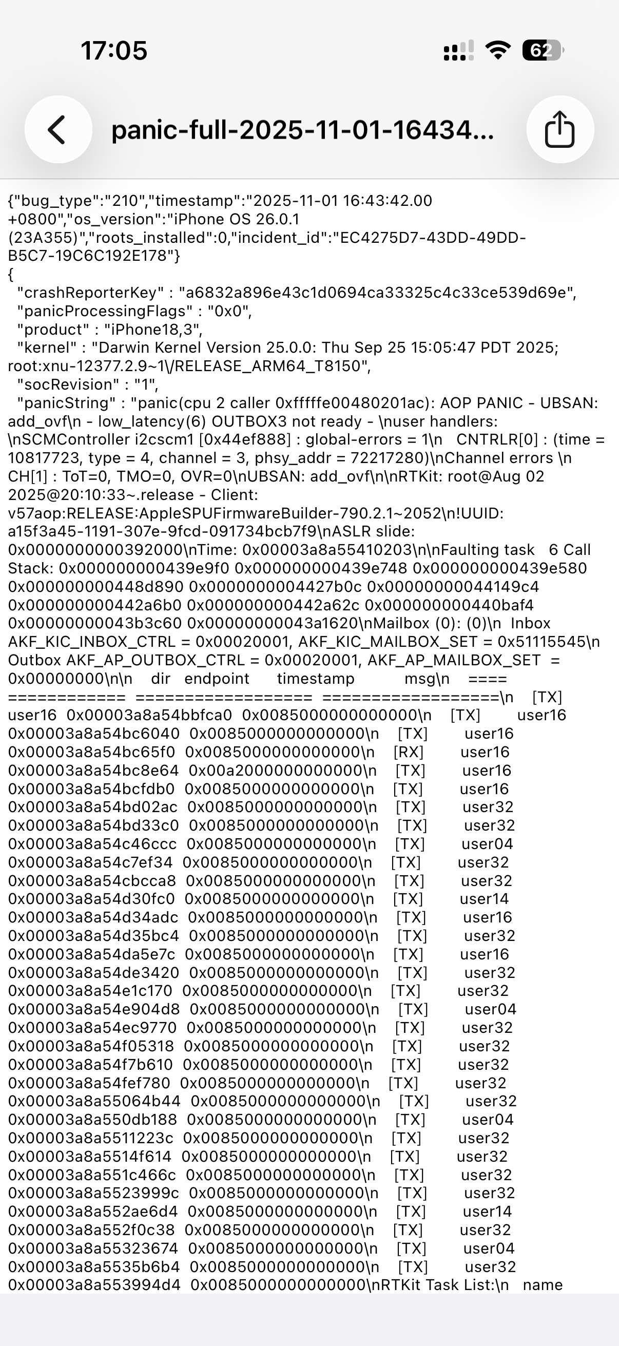 iphone17自动重启panic报告