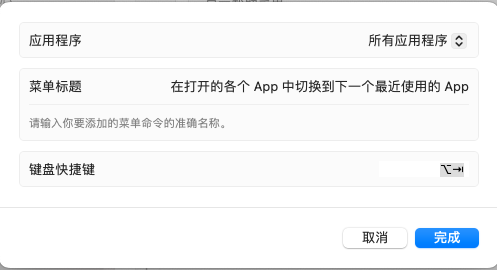 我尝试了在“macOS设置->键盘->键盘快捷键->App快捷键->所有应用程序”添加了组合键:“在打开的各个 App 中切换到下一个最近使用的 App”,但是并没有起作用。Command-Tab对应功能的快捷键是无法修改成其他组合键的吗?