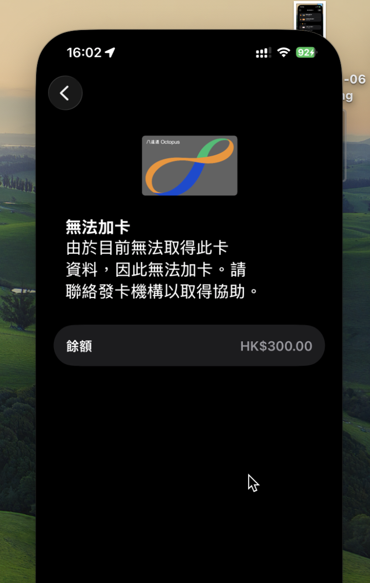 之前在手机上开通个八达通卡后期为方便使用移至apple watch s10上使用。近期,因手表与手机系统不匹配送去某直营门店要求返厂降级系统。于是乎,店员协助抹除手表,后期手表回来不能降级就被迫升级手机。手机重新添加图1的八达通卡