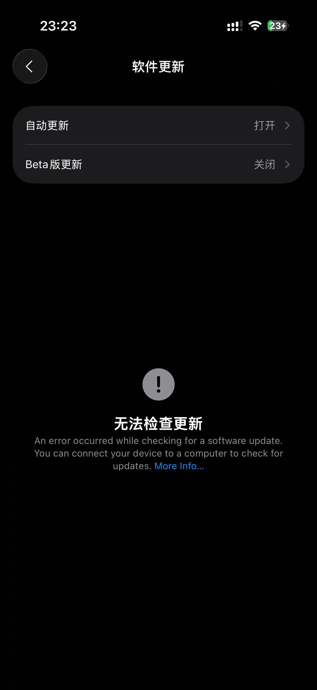 手机出厂版本应该是18.6,数据是从iphone xs传过来的,从买来到现在设置页面一直都会提示有软件更新可用(即使已经更新到最新版本),点进去更新界面又提示无法检查更新,所以我一直以来都是用的电脑更新的系统,目前版本是26.1,打开更新界面后如图,依旧没法更新,这个手机没有装任何用来阻止自动更新的描述文件