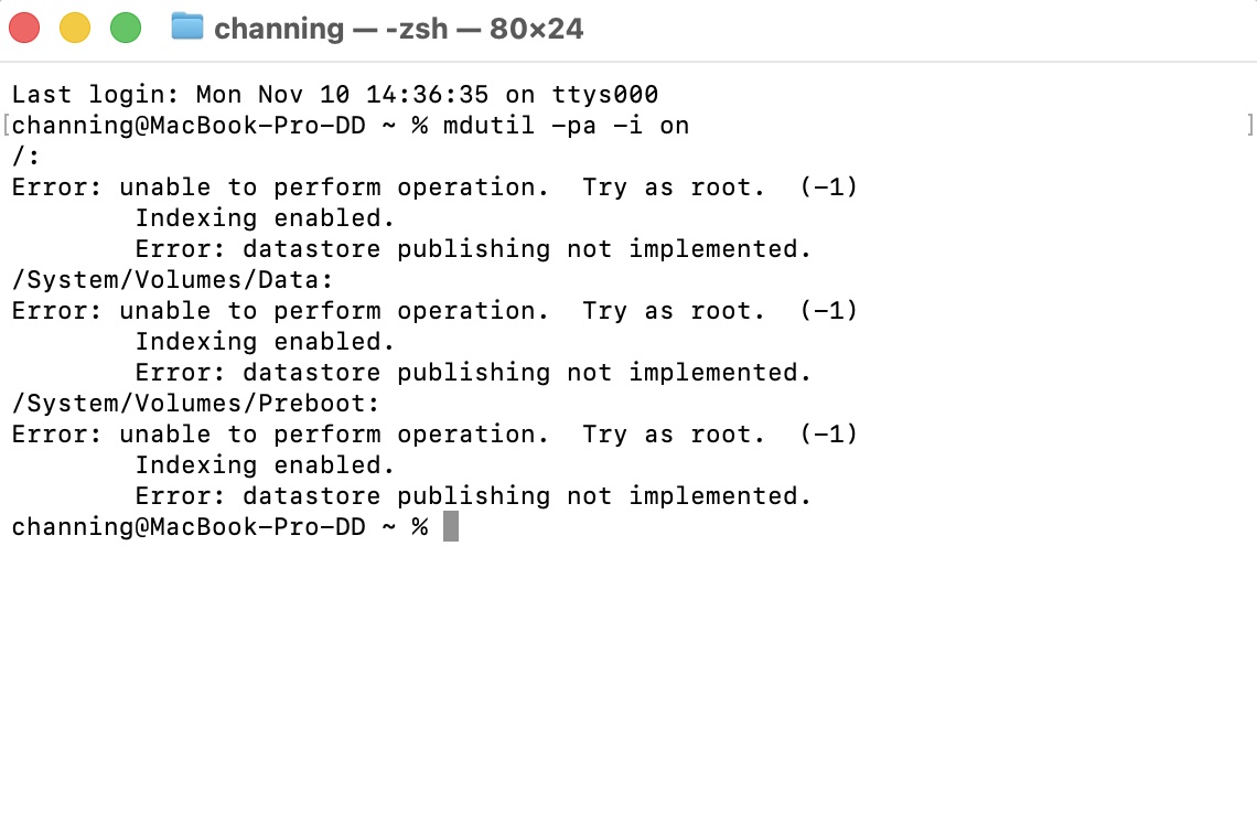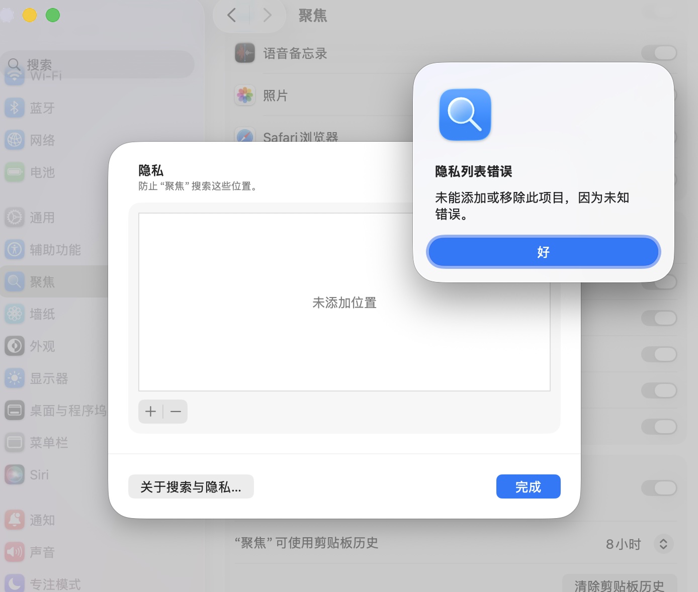 系统更新到26.1后,外接移动硬盘无法用聚焦搜索检索文件。且使用搜索隐私里+放入硬盘然后-剔除之后,忍让无法检索文件。用终端方法“mdutil -pa -i on ”+“mdutil -pa -i on /Volumes/Data”时,显示“unable to perform operation........”。仅仅是外接设备无法使用聚焦搜索,电脑内的文件正常搜索。