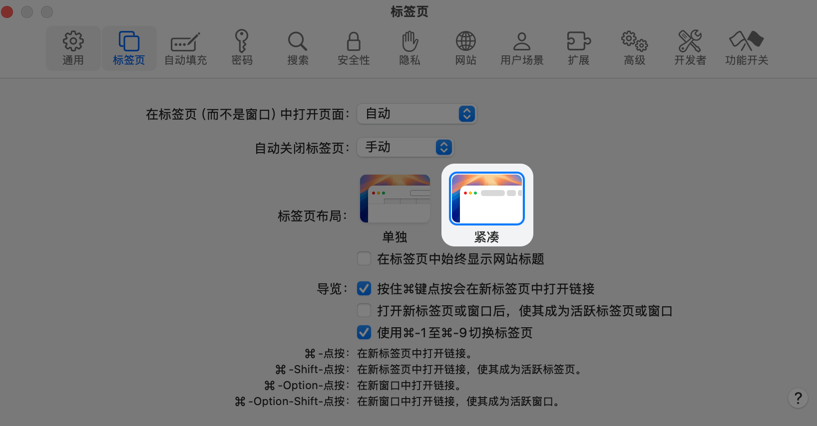 1️⃣在设置中,对标签页布局进行切换并最终选用“紧凑”方式。