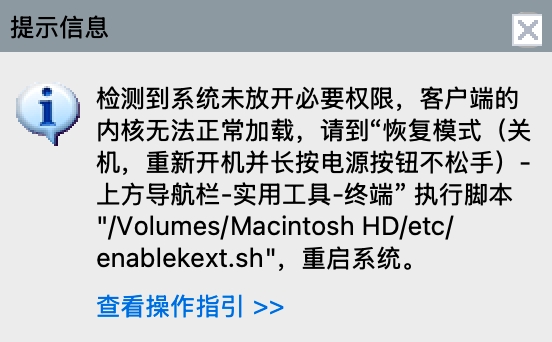 检测到系统未放开必要权限,客户端的 内核无法正常加载,请到"恢复模式(关 机,重新开机并长按电源按钮不松手) 上方导航栏-实用工具-终端"执行脚本 "/Volumes/Macintosh HD/etc/ enablekext.sh",重启系统。
