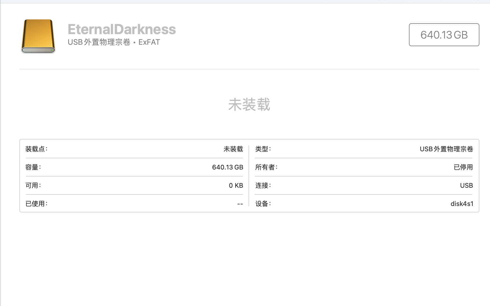 我的移动硬盘在访达的侧边栏里面没有显示,桌面也没有图标,进到磁盘工具里面显示下图