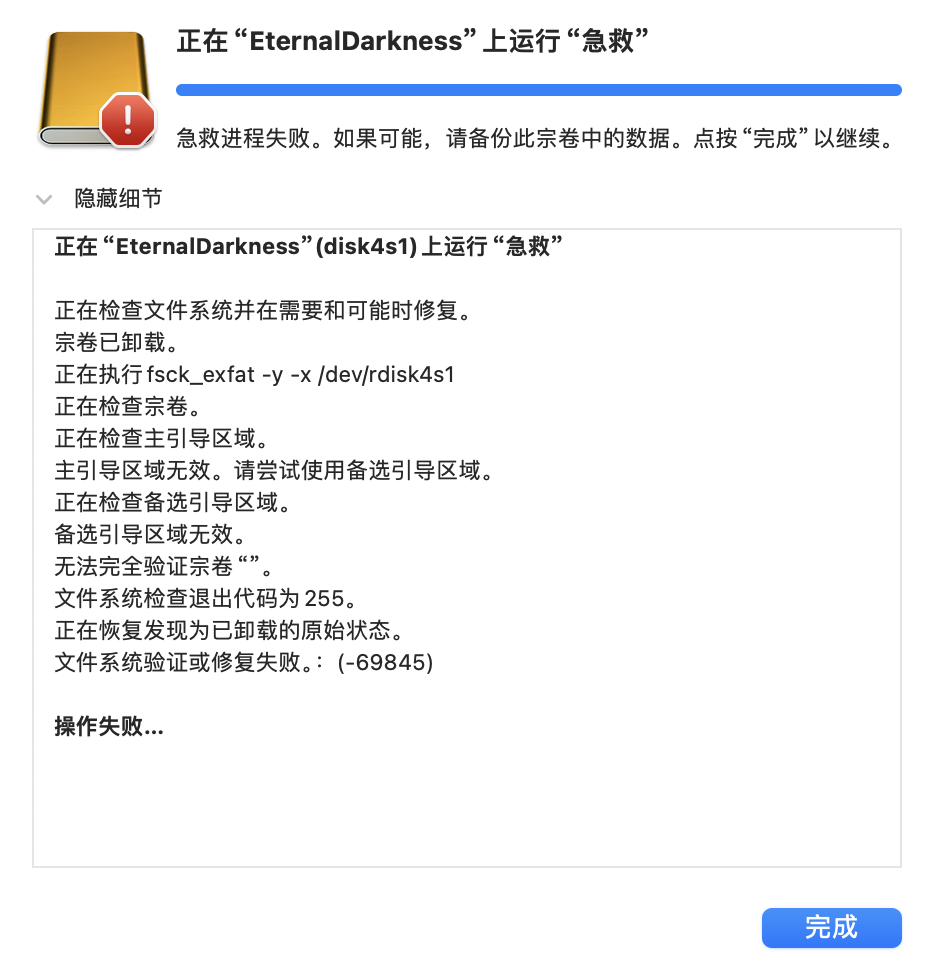 退出代码为255,不是常见的0、1、8,文件系统验证或修复失败(-69845)