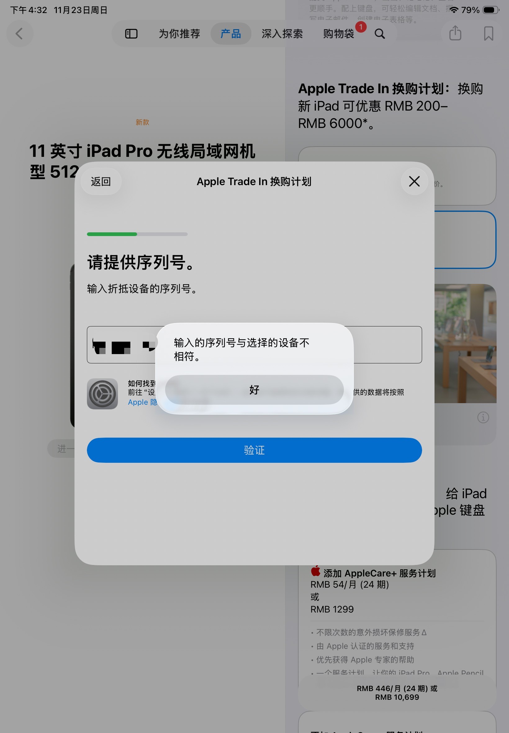 官网购买的iPad Air(M3)在苹果换购输入的序列号后显示“输入的序列号与选择的设备不相符”是什么意思?