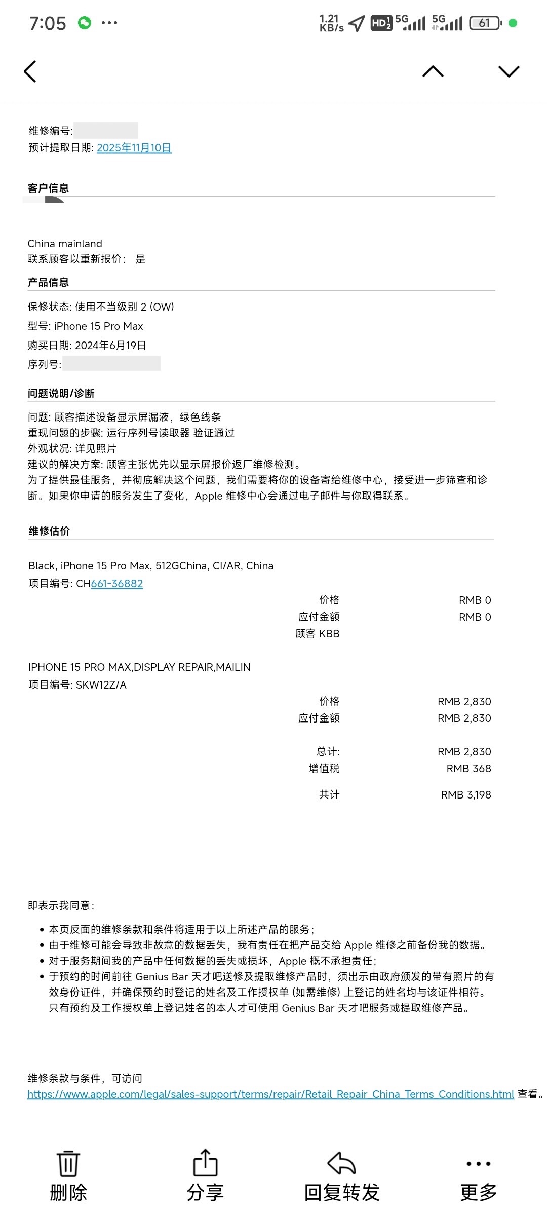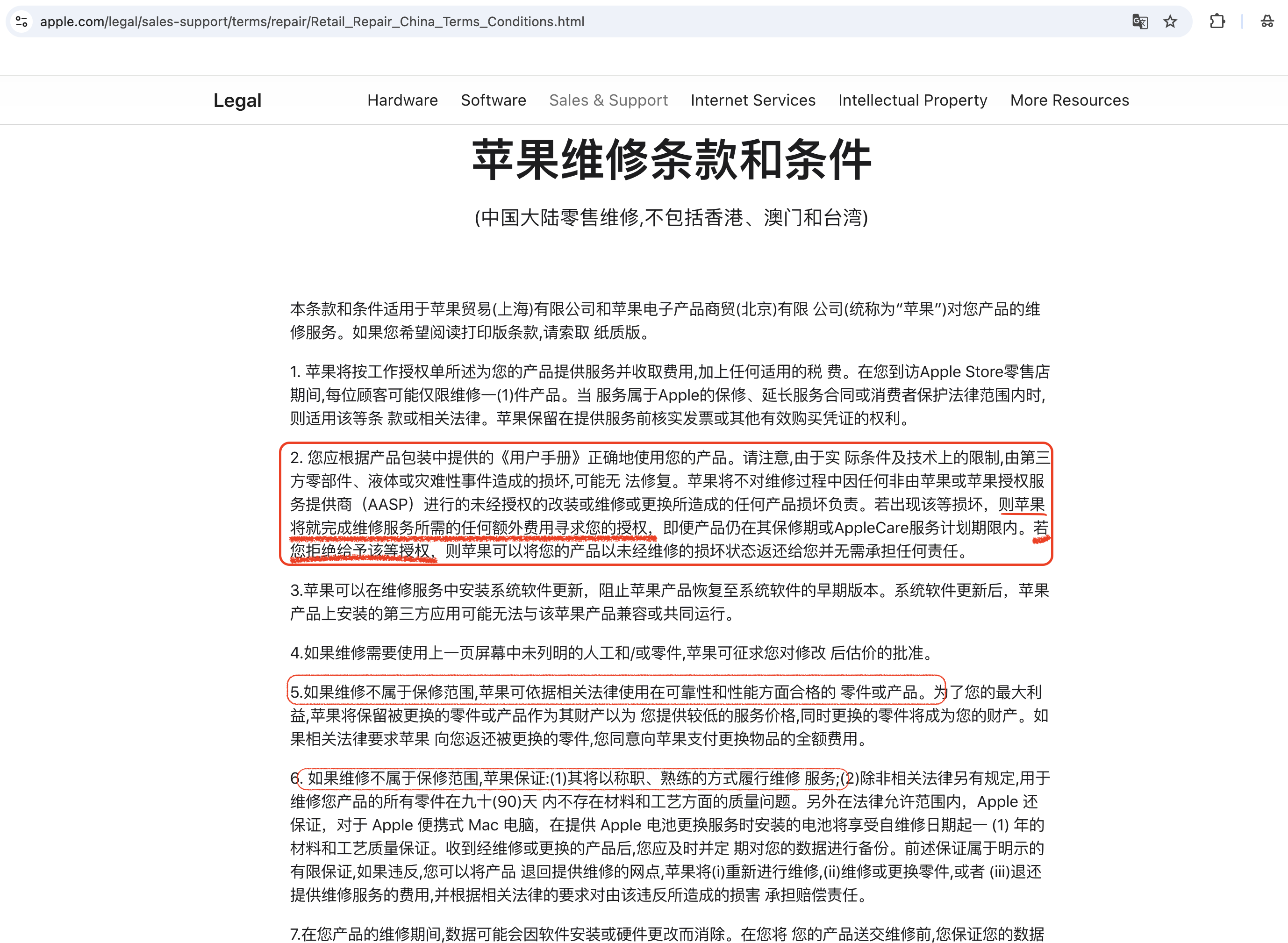 这不是官方套话吗🤣,资料放下面了有没有内行人能帮我查到的原因的感谢~❤️。维修单上写了仅适用的苹果维修条款和条件:第2条:三方部件、私拆、进水等各种原因流程应该先告知我费用,确认我要不要修。我这个不是保修是付费,维修条件里不存在不符合付费维修的条件。他们这个有没有违反正常流程?因为什么原因不符合为啥不能说清楚这有没有侵犯消费者知情权啊?问了维修条件是什么也给不出完整信息,根据维修单上的Apple维修条款与条件