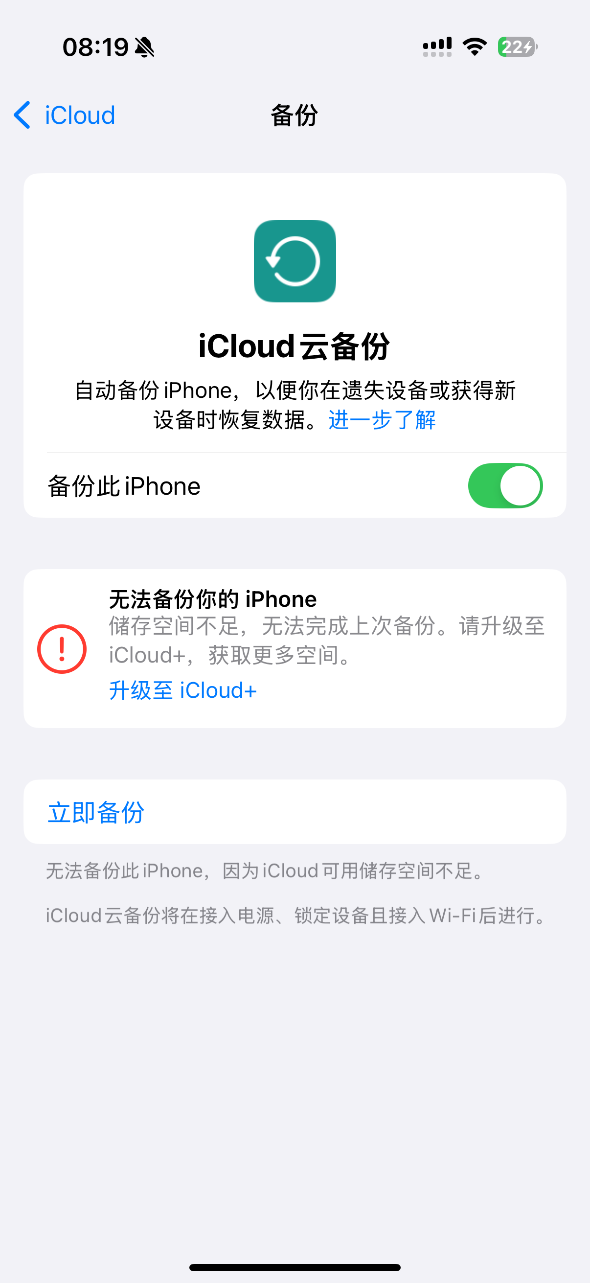 充电并连接 WiFi 点击设置 账号 icloud icloud 云备份 点击立即备份 锁屏半个小时后再看看呢