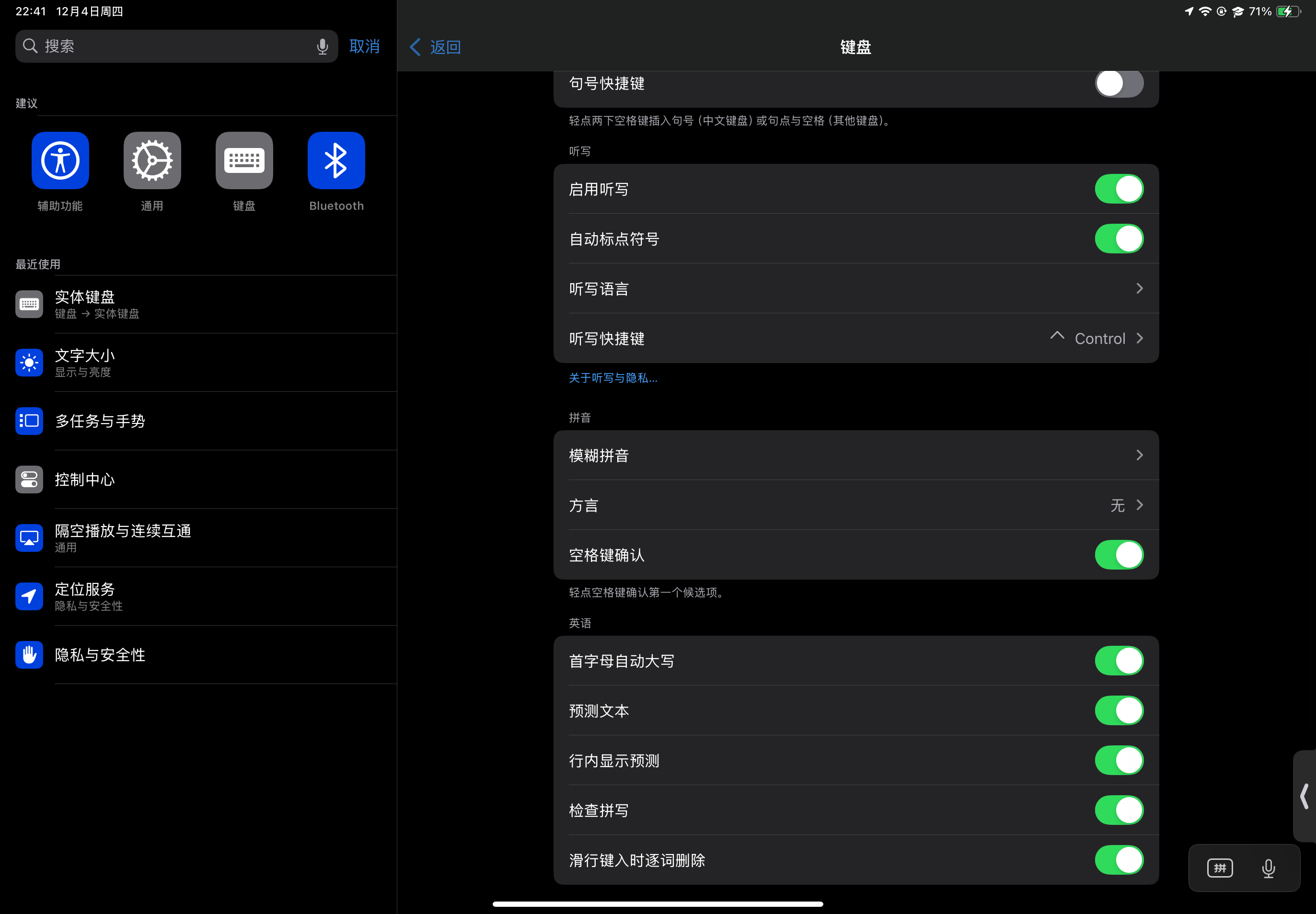 iPad链接键盘第一个候选字看不见的解决办法。看图已解决,找到显示文字大小,在里面设置这三个选项。