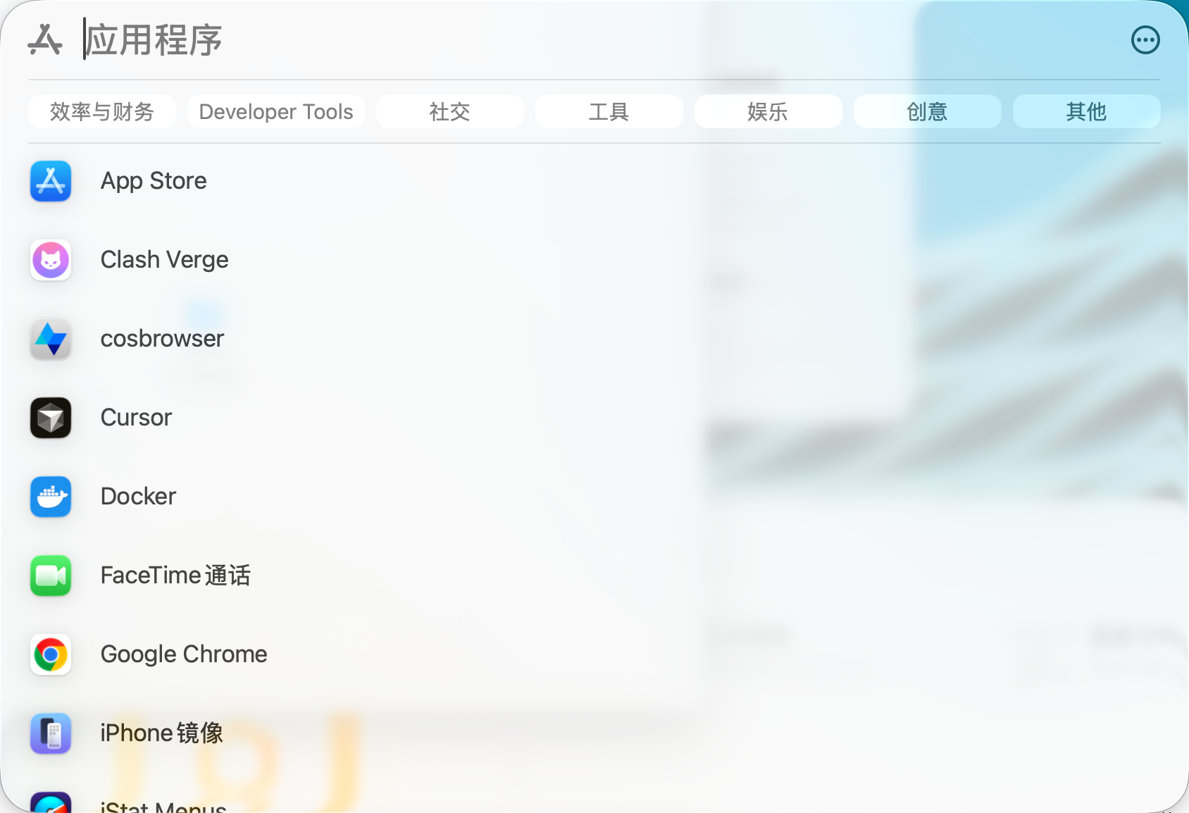 第一张图片中可以看到列表中有 Docker 这个应用,第二张图用 Docker 来搜索却搜索不到。不仅仅是 Docker 搜索不到,还有好几个应用都搜索不到,每次都是手动去找。