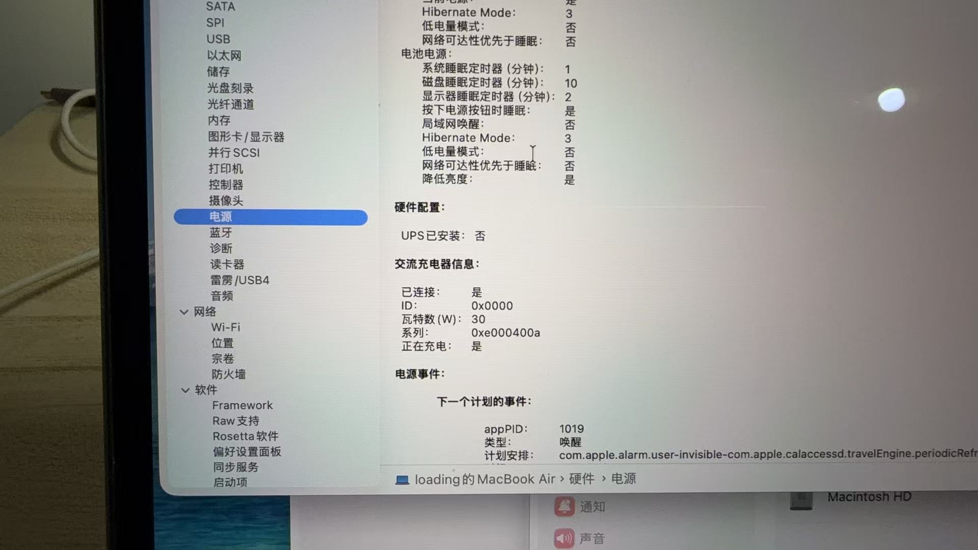 intel芯片的macbook在使用官方充电器时,不管是65w的还是29w的,亦或是20w的充电头,在系统报告-电源页面都可以查询到充电器的规格、序列号以及实际充电功率。