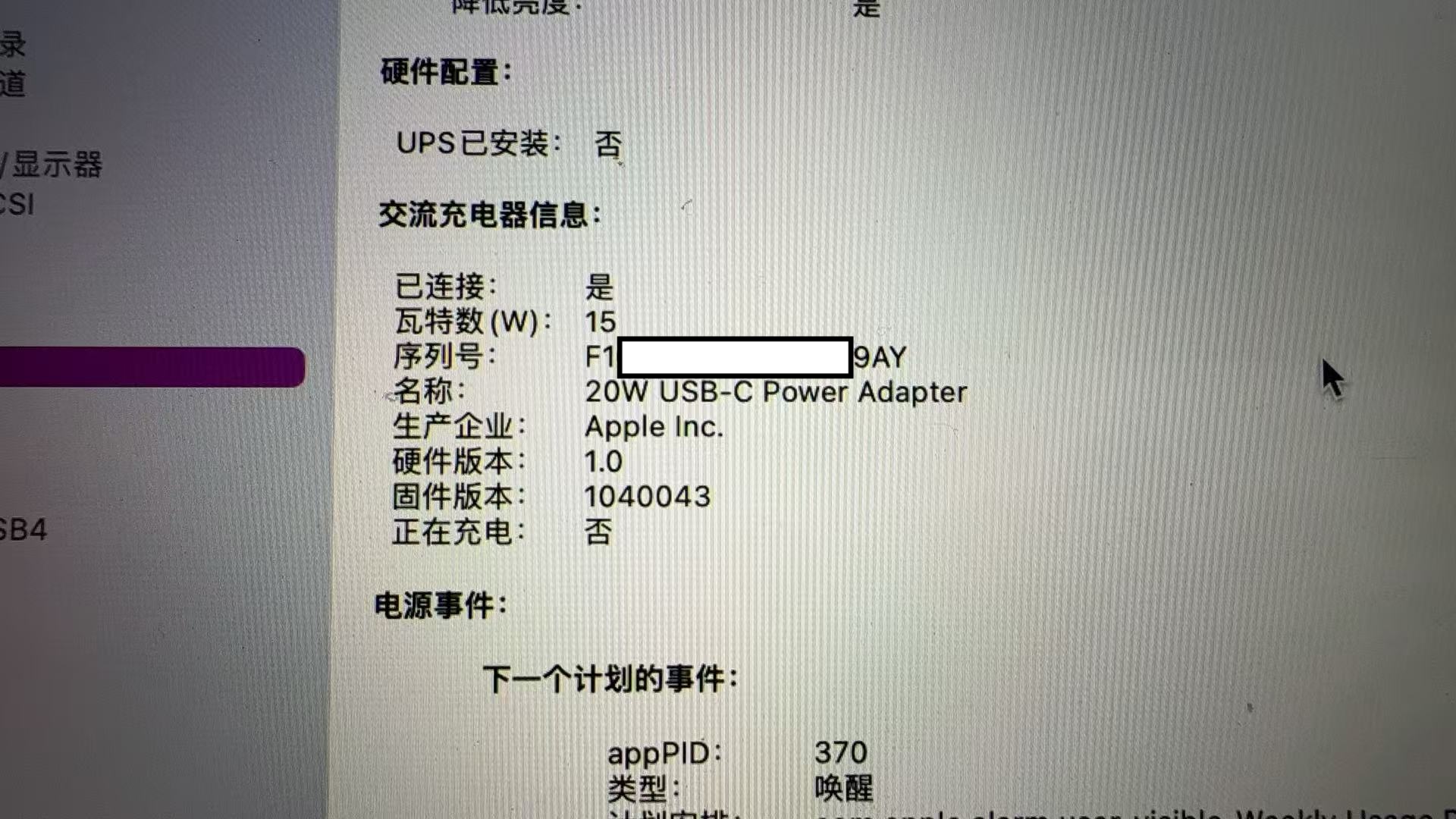 但在刚收到的一台m1芯片的macbook air上却无法显示充电头的序列号。