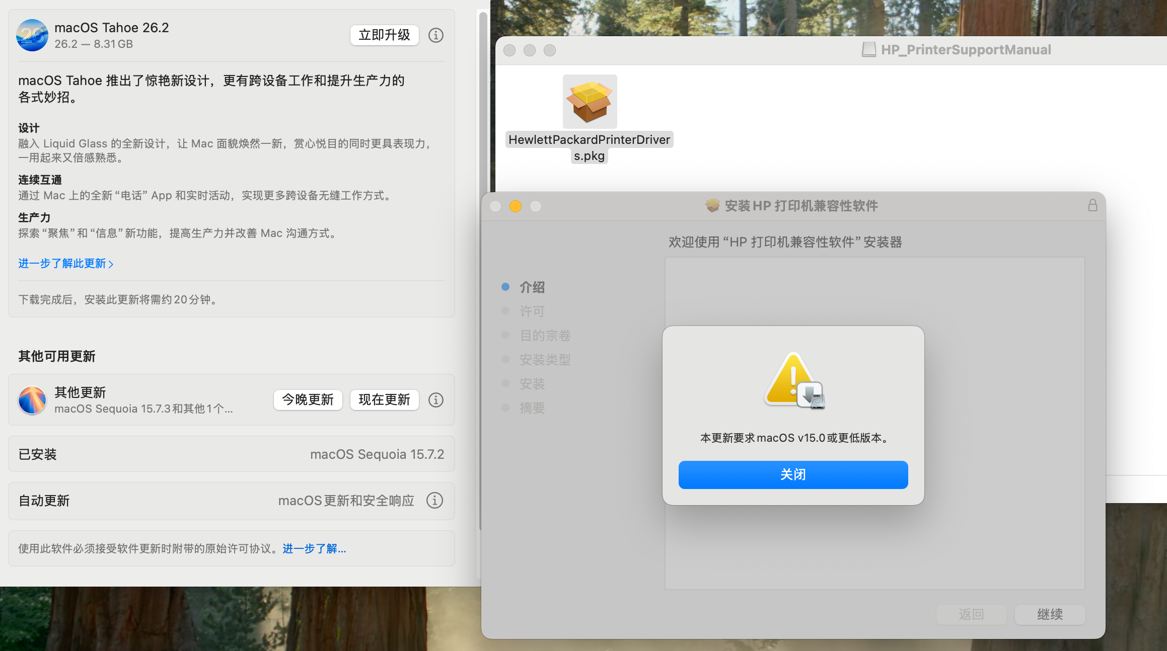 找到之前的Hewlett-Packard 打印机驱动程序 1.1.1,下载后显示macOS v15.0以上的无法使用,目前系统在v15.7.2,