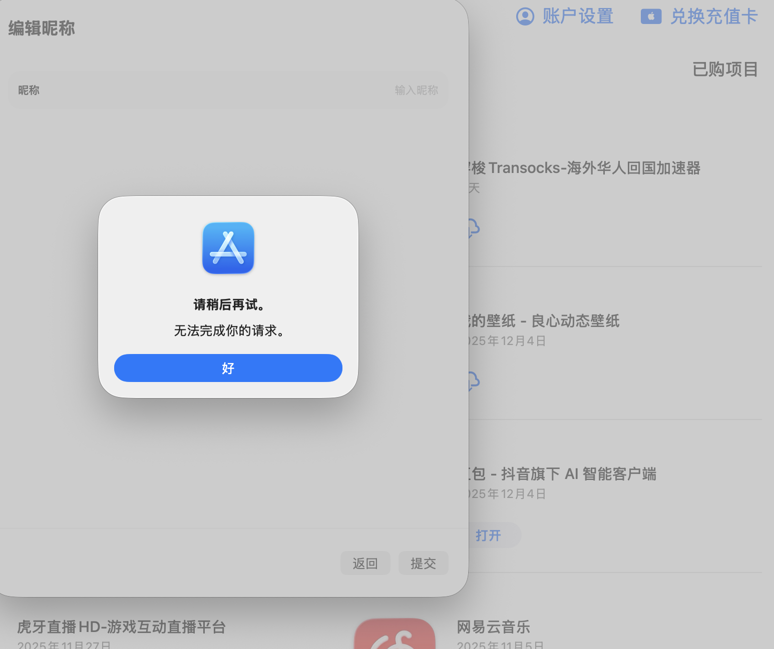 在app store中账户设置里的昵称更改不了。我不记得有设置过这个昵称,就是这个1)bdj,一更改就出现错误,试过好几次了不知道为什么,求解答。感谢。