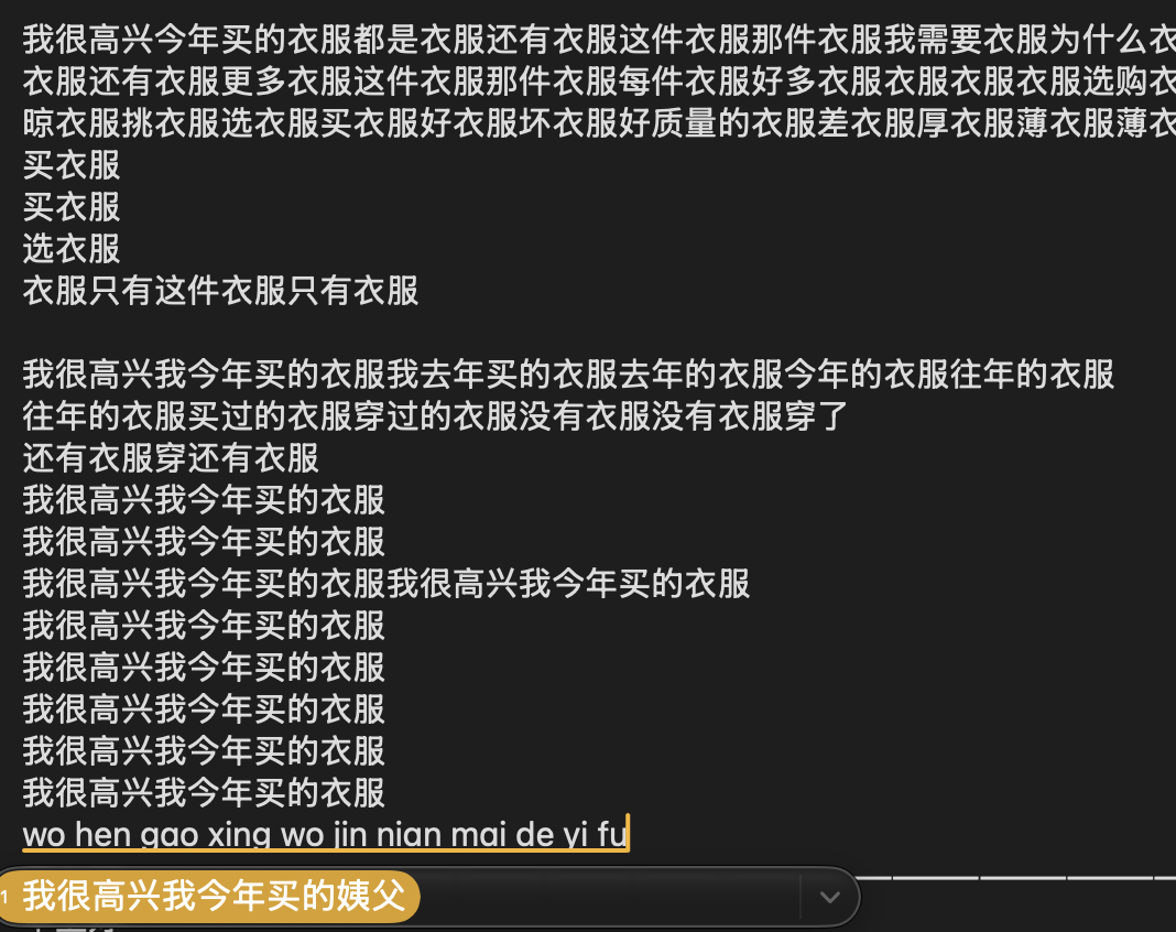 我最近长期受这个问题困扰:我知道有些词语的使用是可以通过提升正确使用的频率来提高它在选词队列中的优先级的,而且这个提高(前)的过程不是一个简单的算法,但是整体肯定是用的频率越高出现越靠前。但是有两个词语会出现明显的逆规律,带来输入的极大不便,一个词是斑,任何我想要使用班级的班的时候,版本的版的时候,那个错误的斑总会出现在非常靠前一般是第一个词语的位置(包括输入这条“一般”的时候),尽管我极少使用“斑”字,它永远出现在非常靠前的,往往是第一个的位置,让我感到非常困惑,还有就是这个衣服和姨父的错误了,更是令人恼火,我极少使用后者(主动使用的次数几乎为0),并且更常用姨爹来称呼,而衣服的使用频率非常高,每次看到我想要出现“衣服”词样的位置出现了后者便会令我感到困惑,而且出于我以为对算法的理解,我会常常碰到问题后就用大量的语料来更正,直到上面这张图击垮了我记录日记的热情。